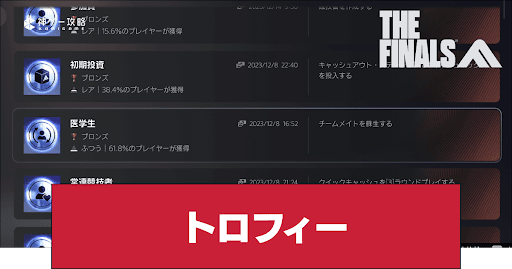 THE FINALS(thefinals)のトロフィーについて解説。トロフィーの一覧と入手条件、取り方のコツについても掲載しているので、ファイナルズの参考にどうぞ!