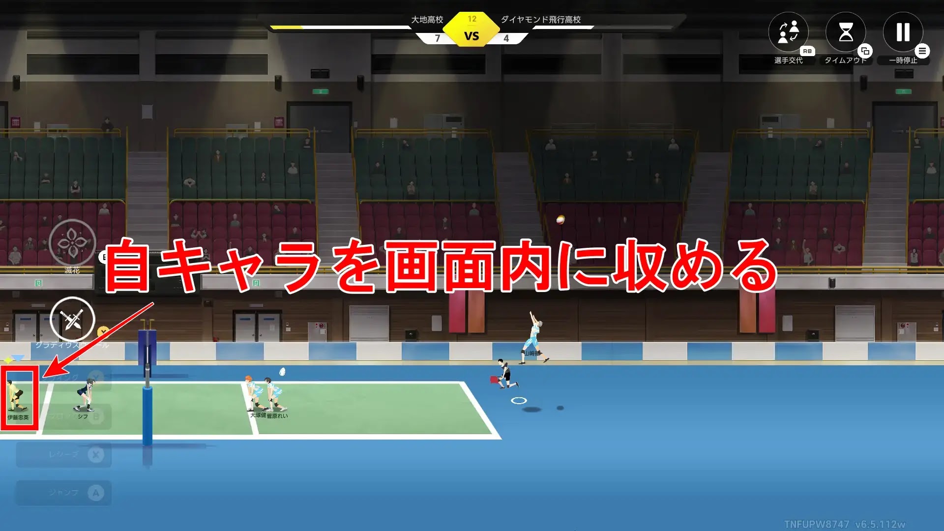 相手のサーブはレシーブで受けると体力が削られるため、体力消費のないフライングで取るのがおすすめだ。自キャラの位置が分かりづらい時は、まず相手サーブ中にネット際まで移動して場所を把握しよう。キャラ確認後は大まかなボールの着地点に向かいながら、フライングすると取りやすい。
