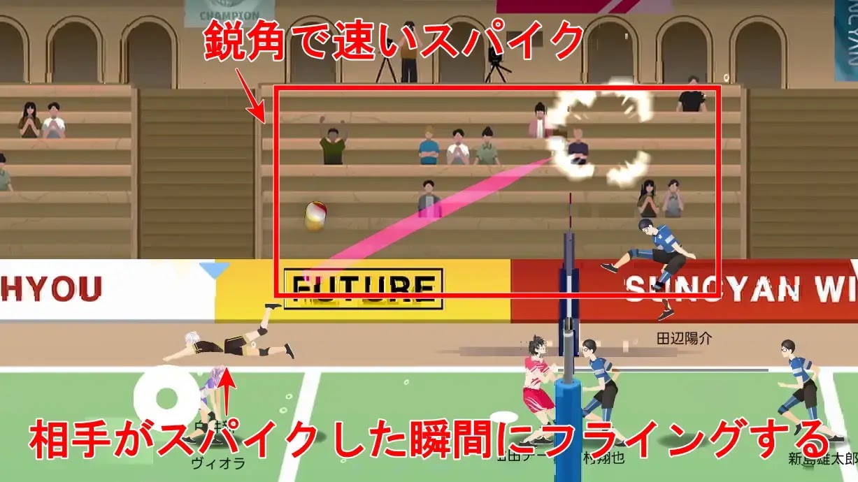 フライングはブロックと違い、攻撃に使えないがほとんどのスパイクに対応できる手段だ。ブロックが届かない相手には、フライングすると体力温存しながら安定した試合ができる。