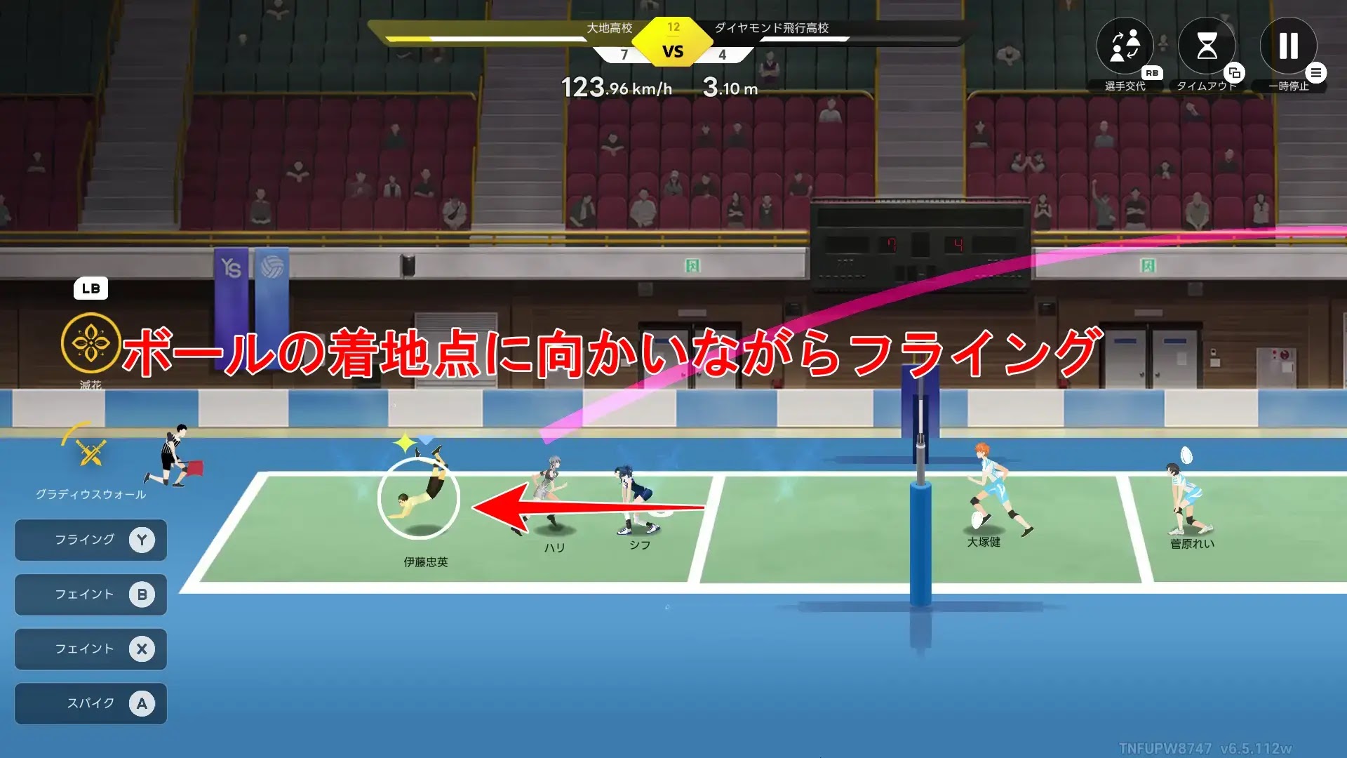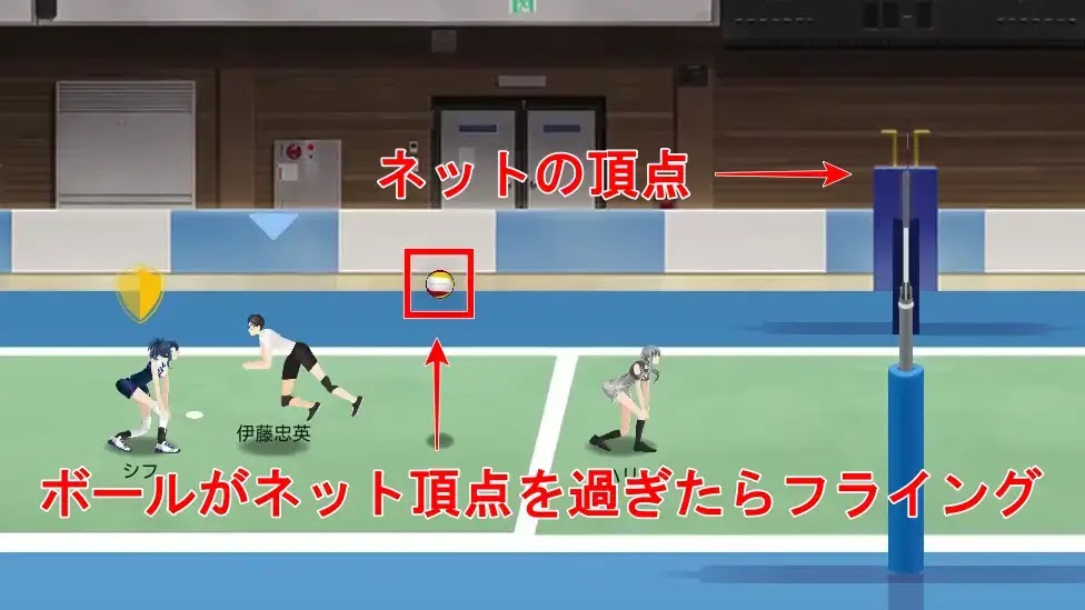 フライングは発動後に大きな隙が生じるため、相手のスパイクや味方のトスに間に合わない時がある。攻撃や守備に対応できないと思ったら、レシーブやブロックに切り替えよう。