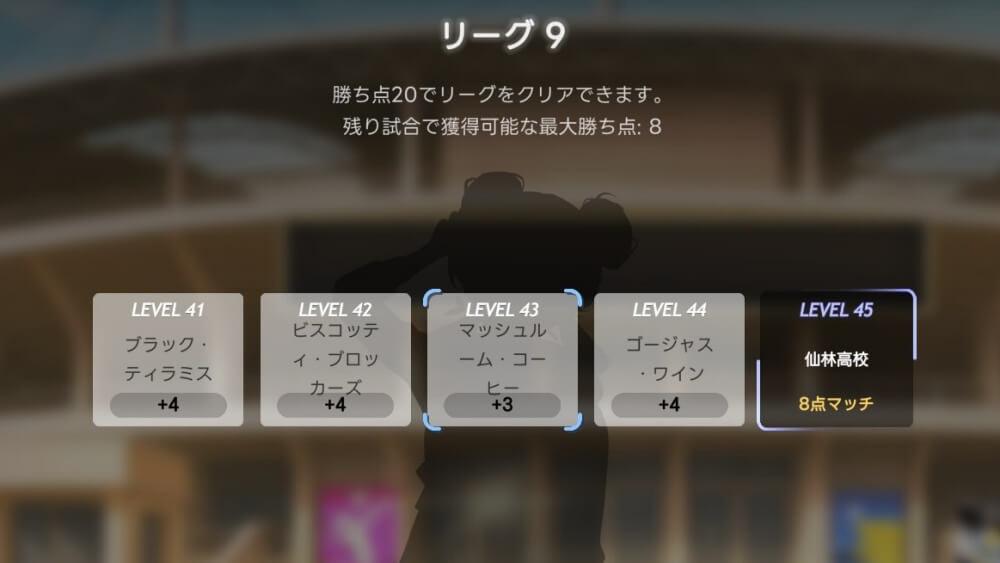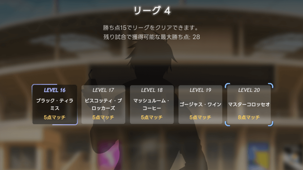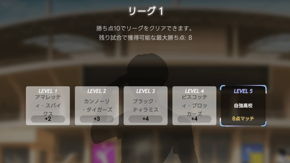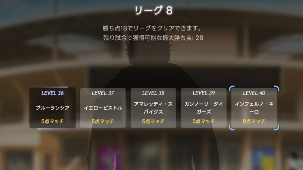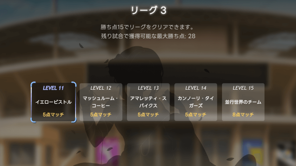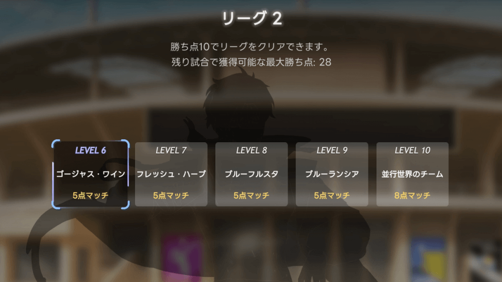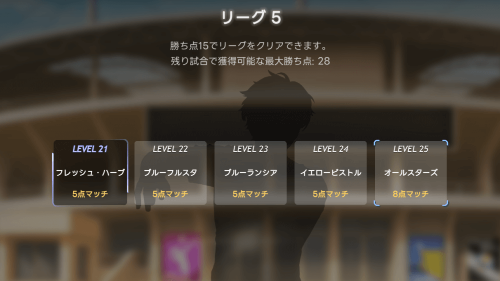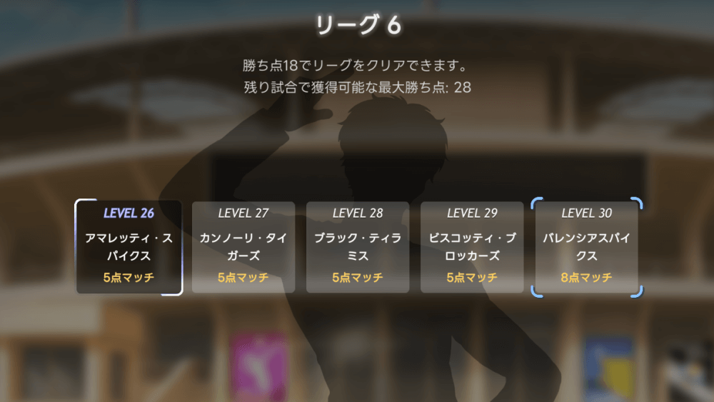 各リーグには目標勝ち点が設定されており、目標に到達した状態で5連勝するとクリアとなる。勝ち点は、試合に勝利した時に「味方の得点-相手の得点」の差分を獲得可能だ。