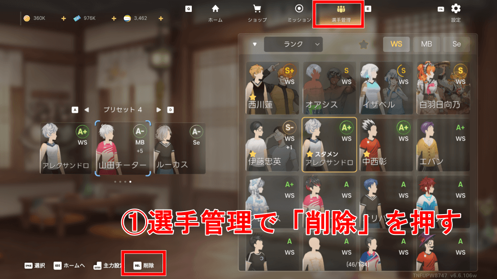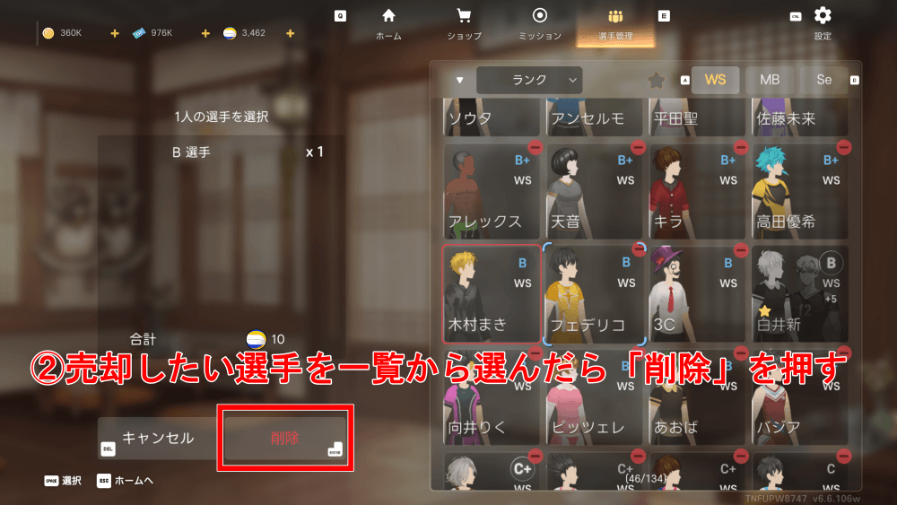 選手を売却したい時は、まずホーム→選手管理を開いて削除かゴミ箱アイコンを押そう。その後、選手を選んで削除を押すと売却できる。