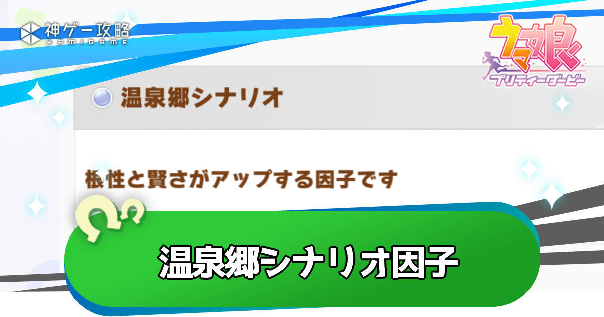 ウマ娘プリティーダービーにおける「温泉郷シナリオ因子」について解説。シナリオ因子の効果や入手条件(入手方法)をはじめ、シナリオ因子周回のやり方も掲載しているため、温泉郷シナリオ因子の参考にどうぞ!