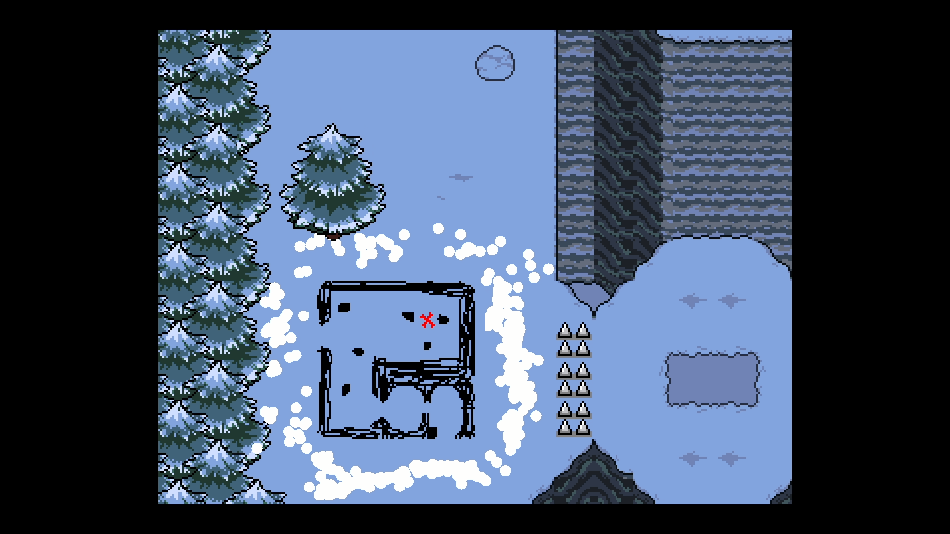 2つ目のパズルは、スイッチを押して塞いでいる道を開ければクリアだ。スイッチはエリアの右上にある雪が積もっていない部分に隠されており、エリア下にある白い雪をどかすとヒントが現れる。