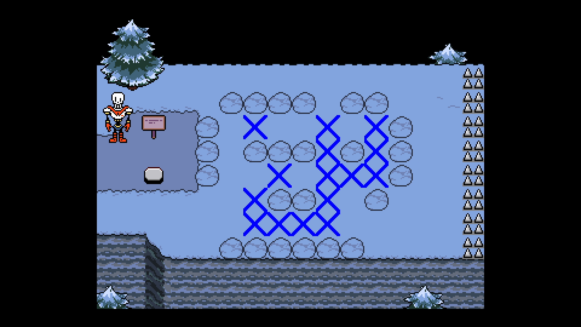 4つ目のパズルは、パピルスに話しかけるとヒントと答えを教えてもらえる。2回話しかけるとヒント、3回話しかけると木にスイッチの存在を話すため、パピルスの左にある木を調べよう。木のスイッチを押しスイッチを踏むと自動で全て◯になるため、踏まずにクリア可能だ。