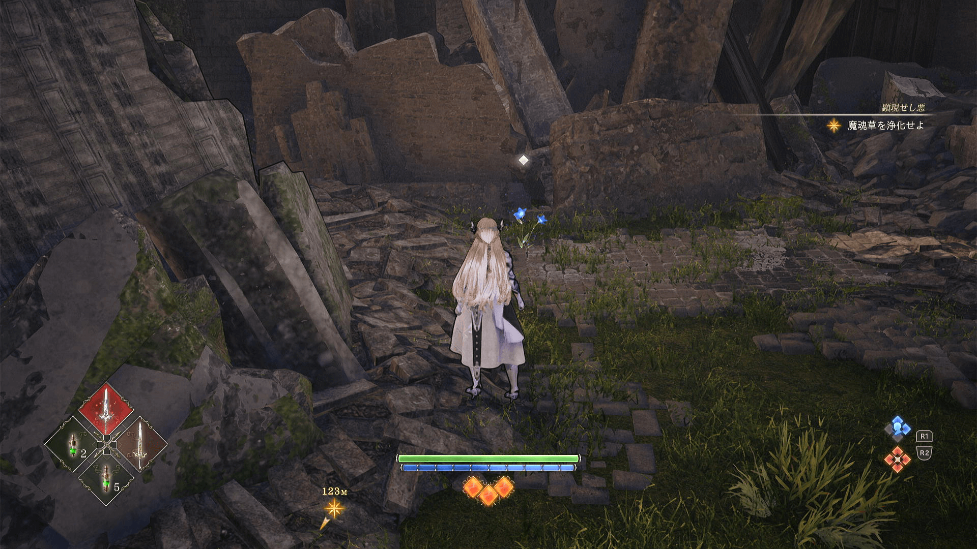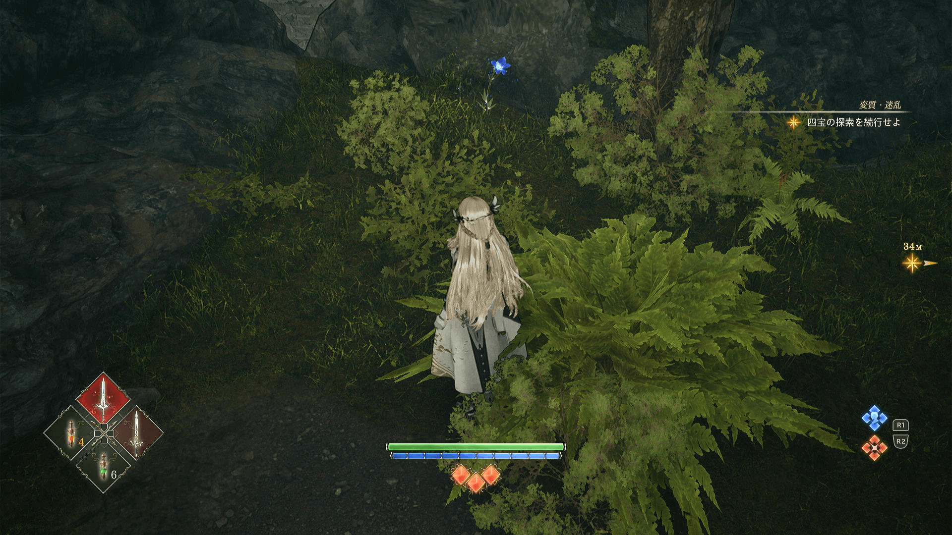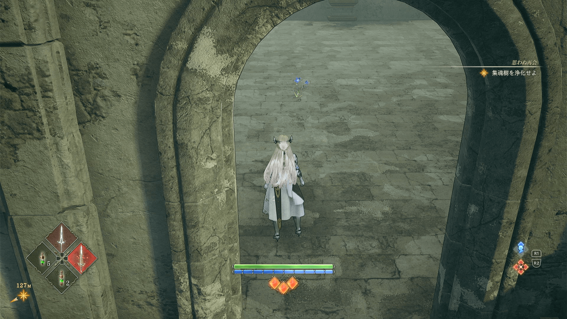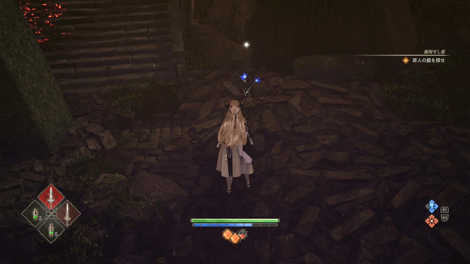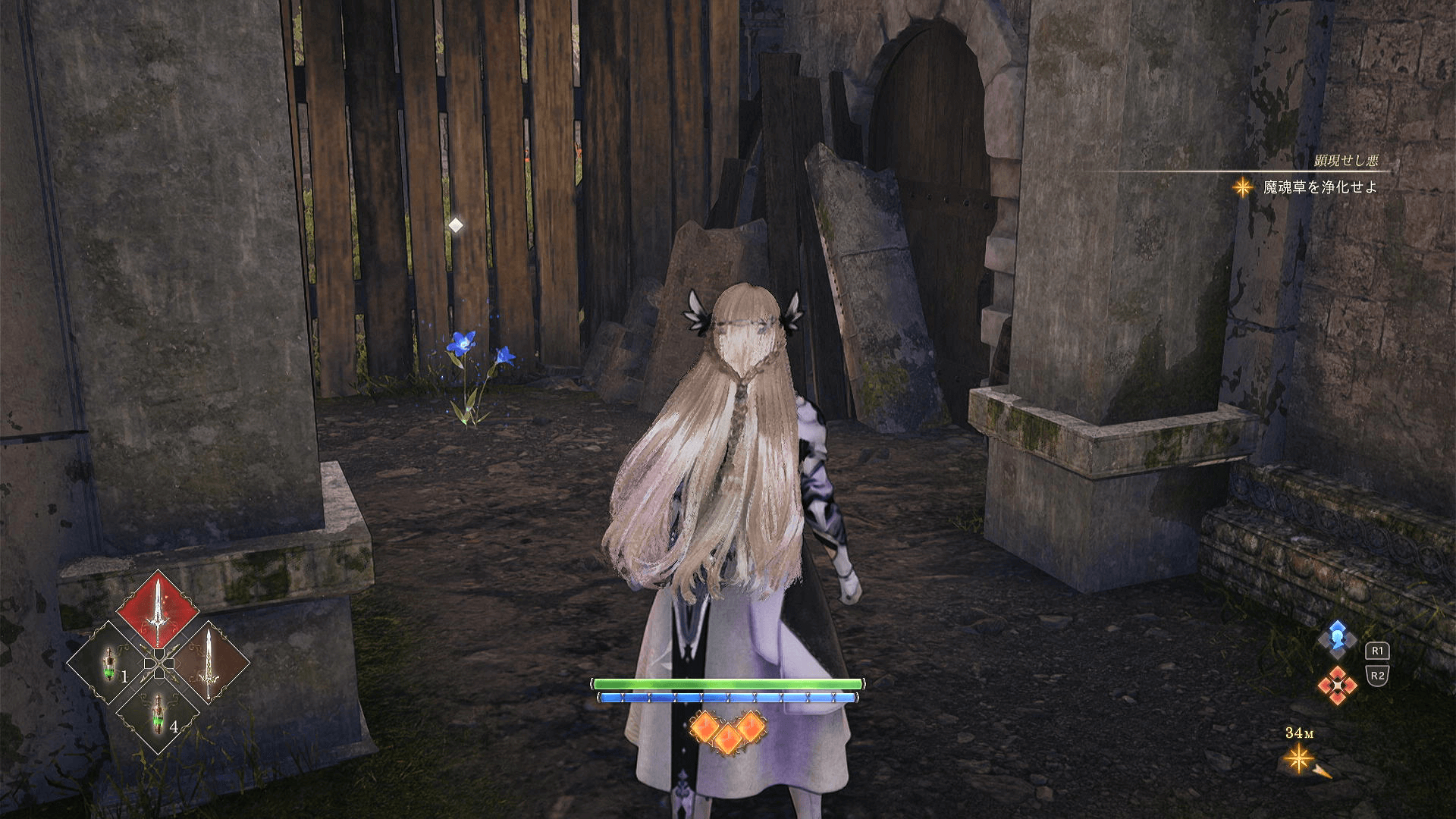 欠魂花とは、各マップに点在する収集アイテムのことだ。欠魂花は青い花の見た目をしており、近づいてL2ボタンを押すと入手できる。