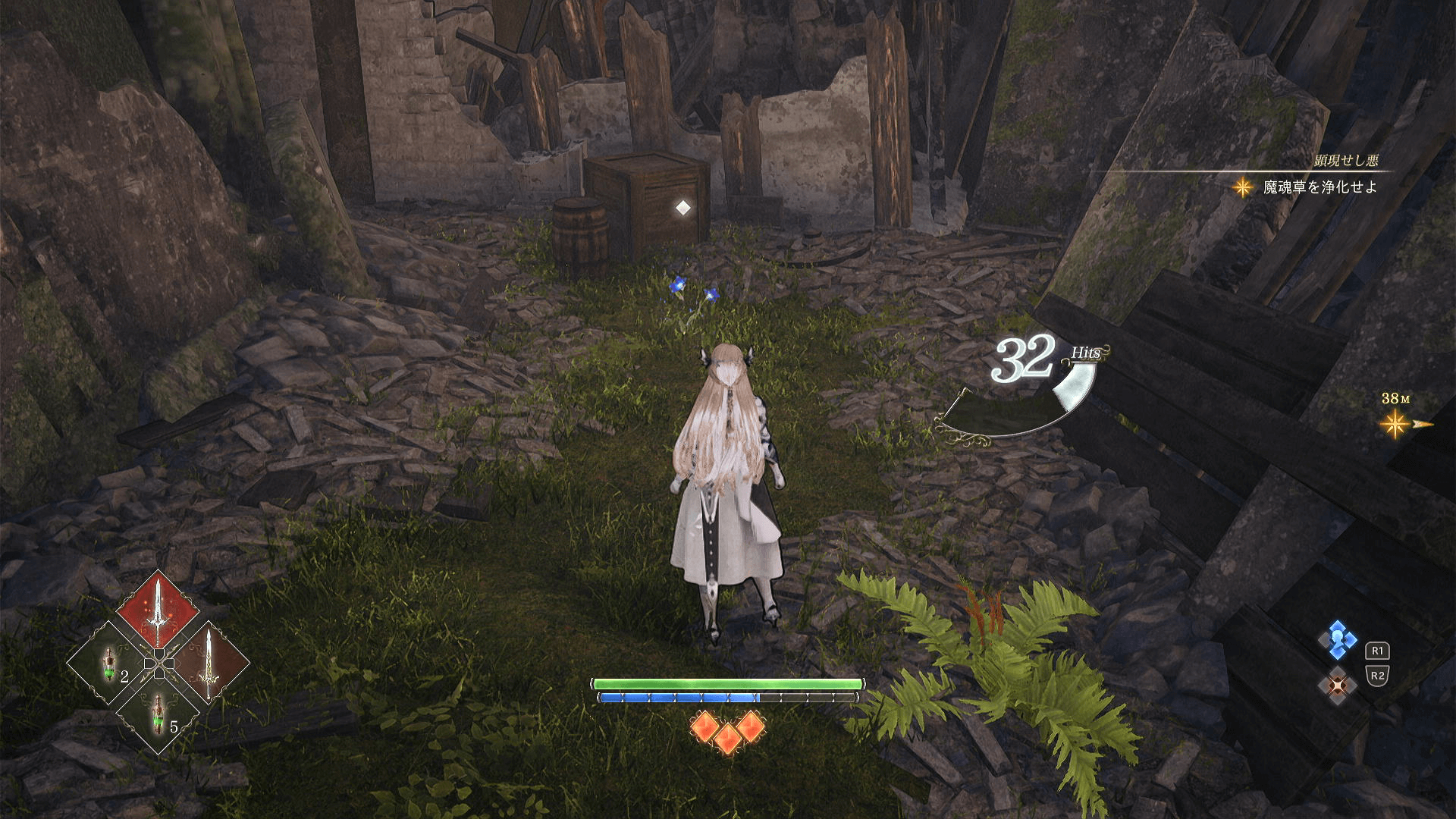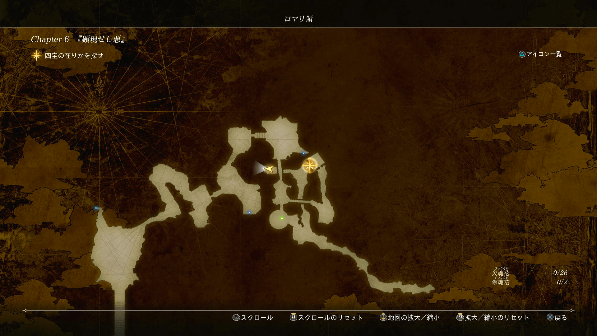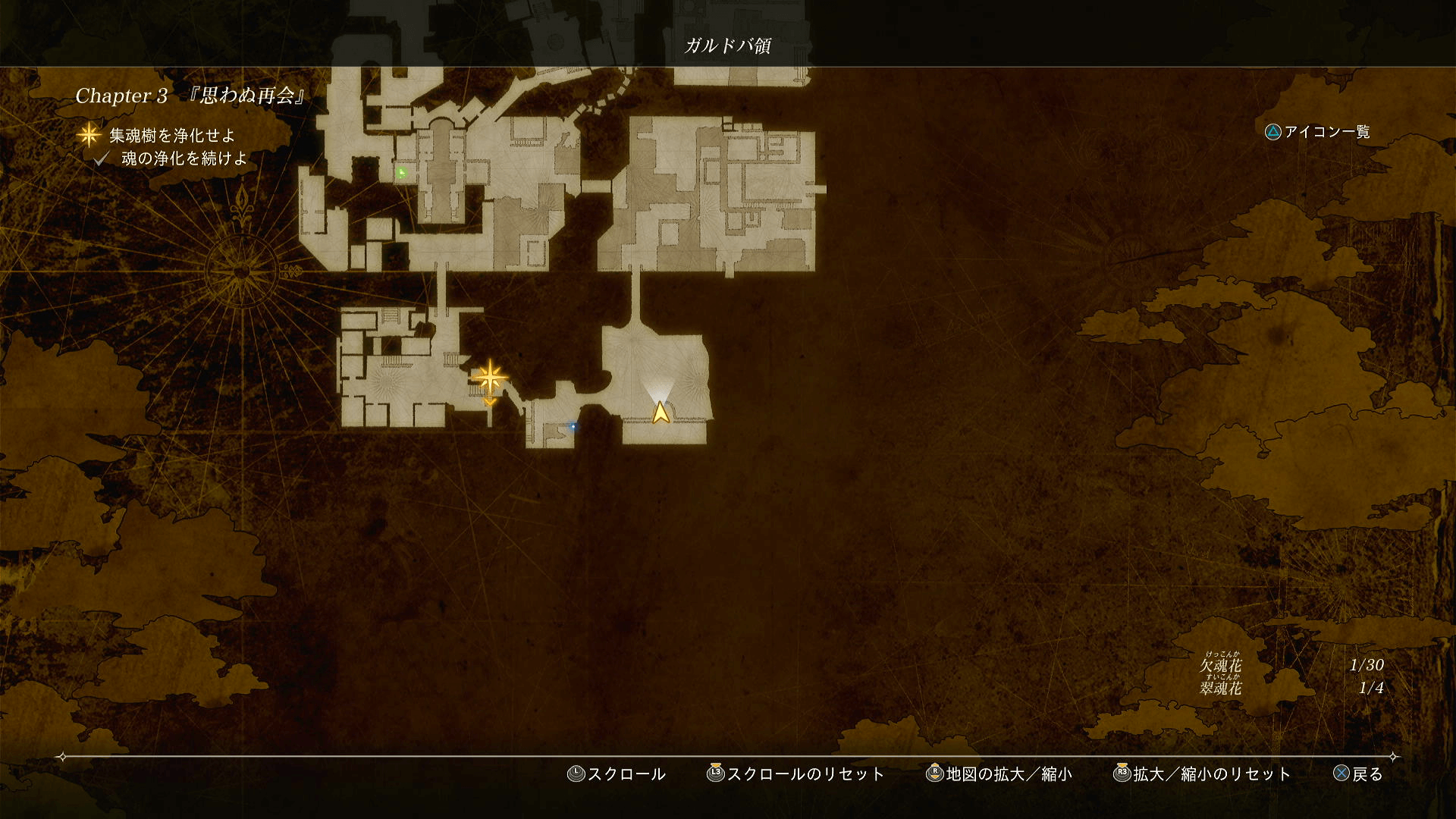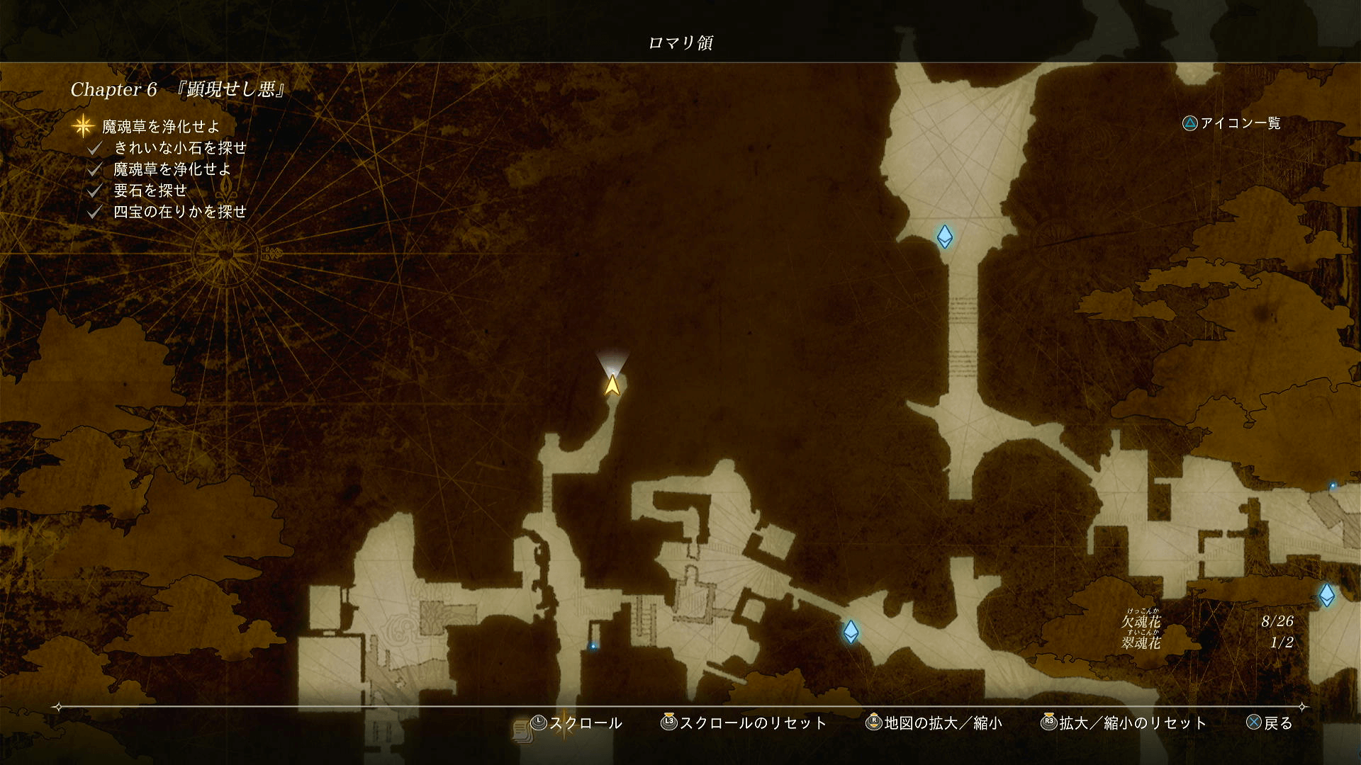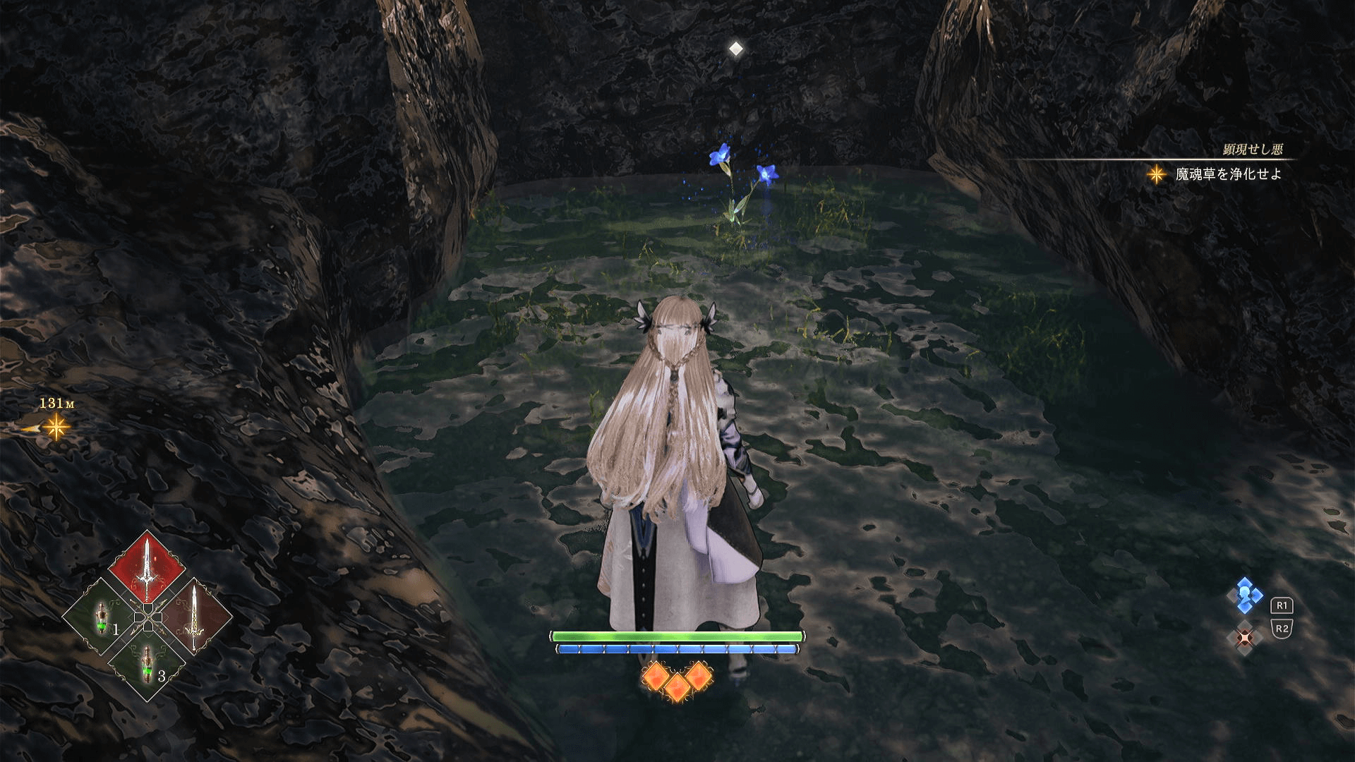 欠魂花とは、各マップに点在する収集アイテムのことだ。欠魂花は青い花の見た目をしており、近づいてL2ボタンを押すと入手できる。