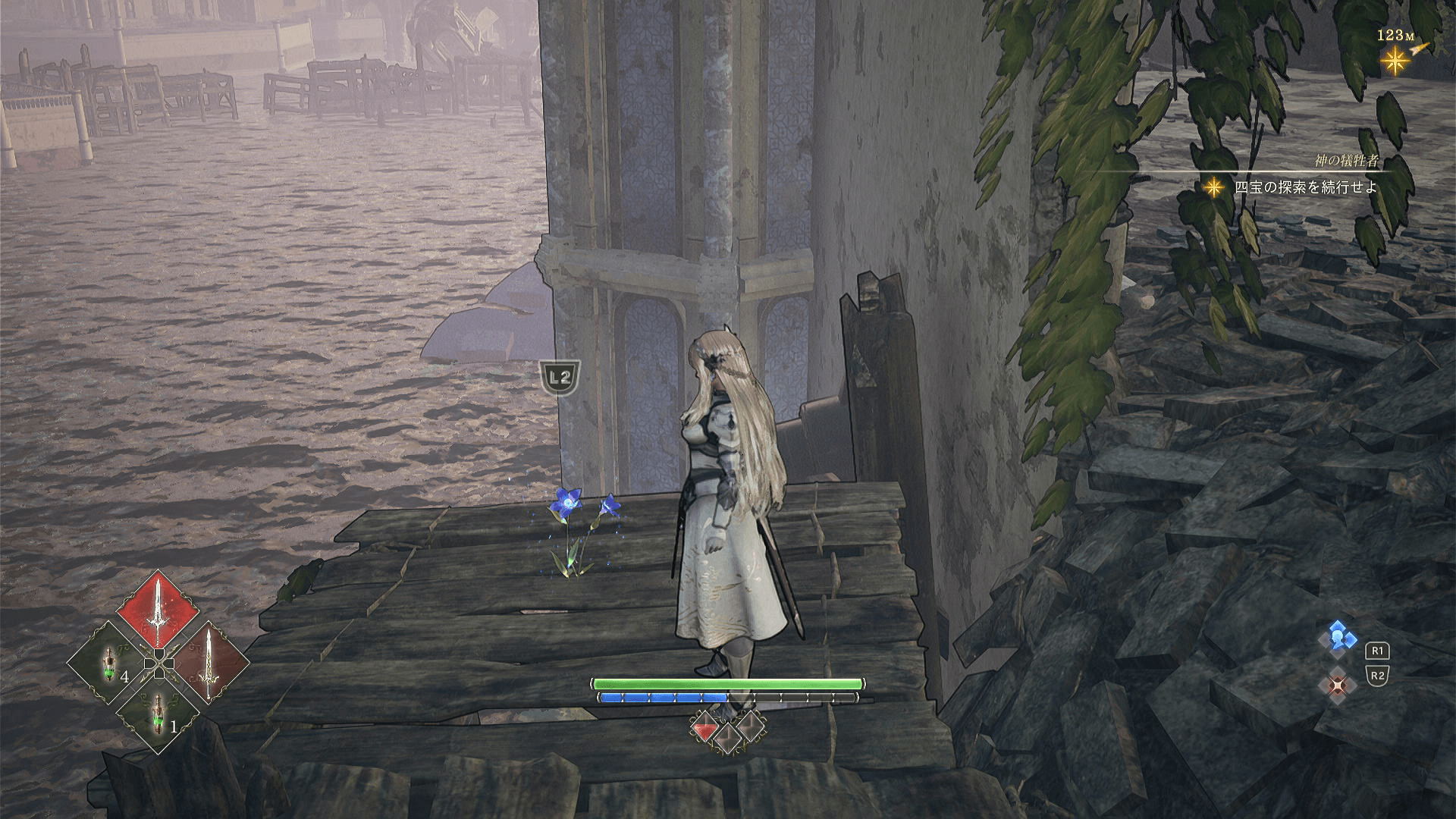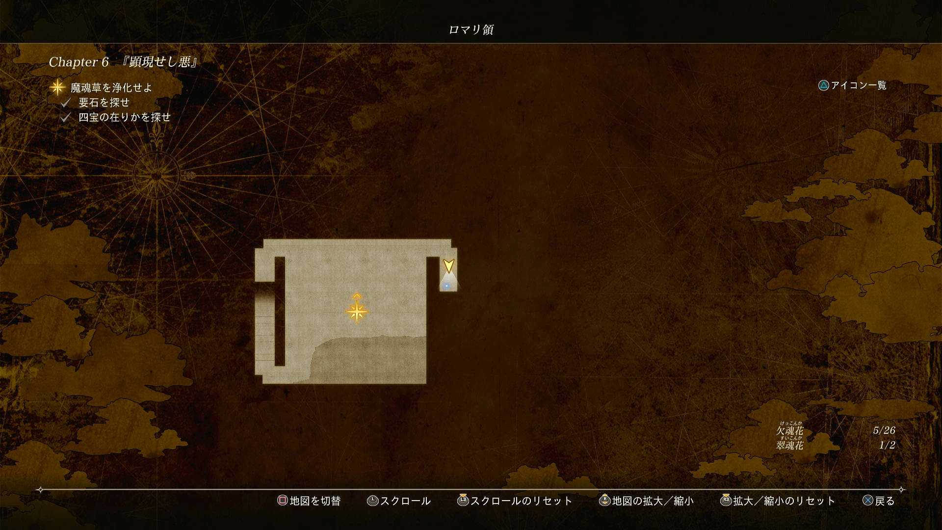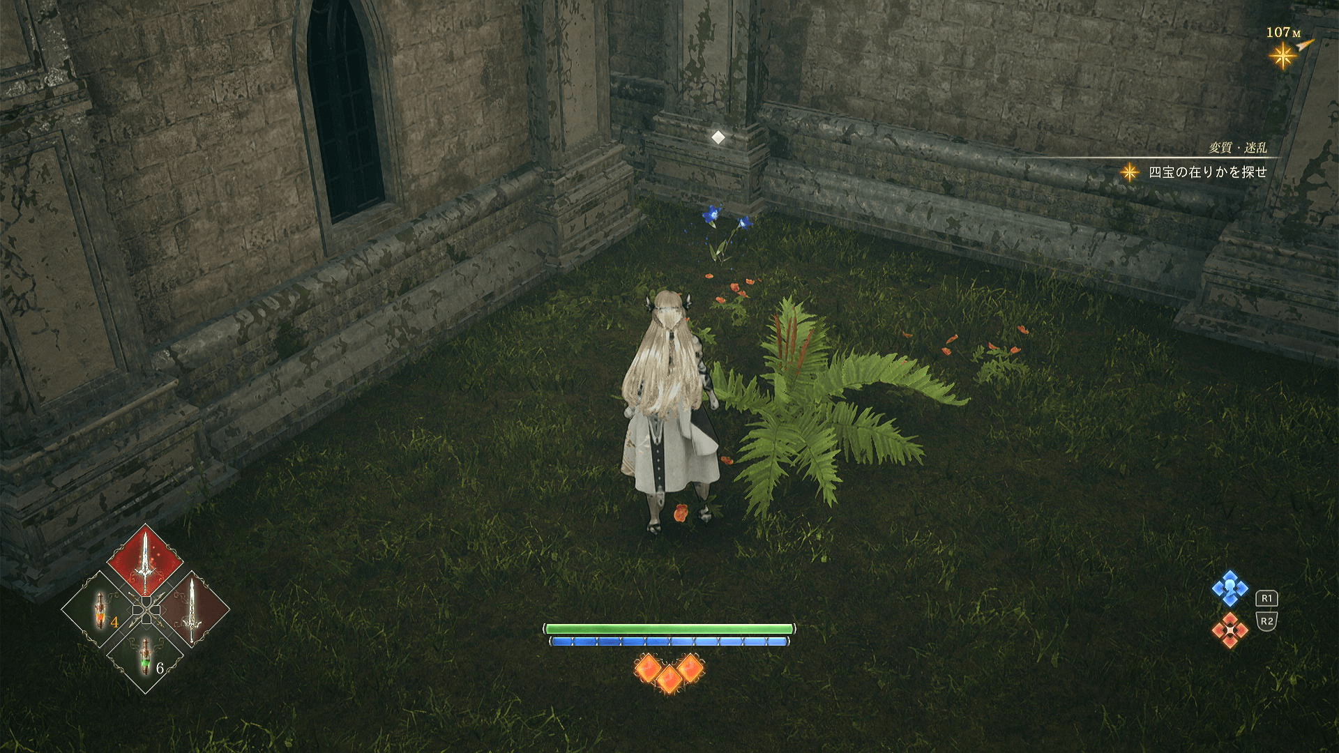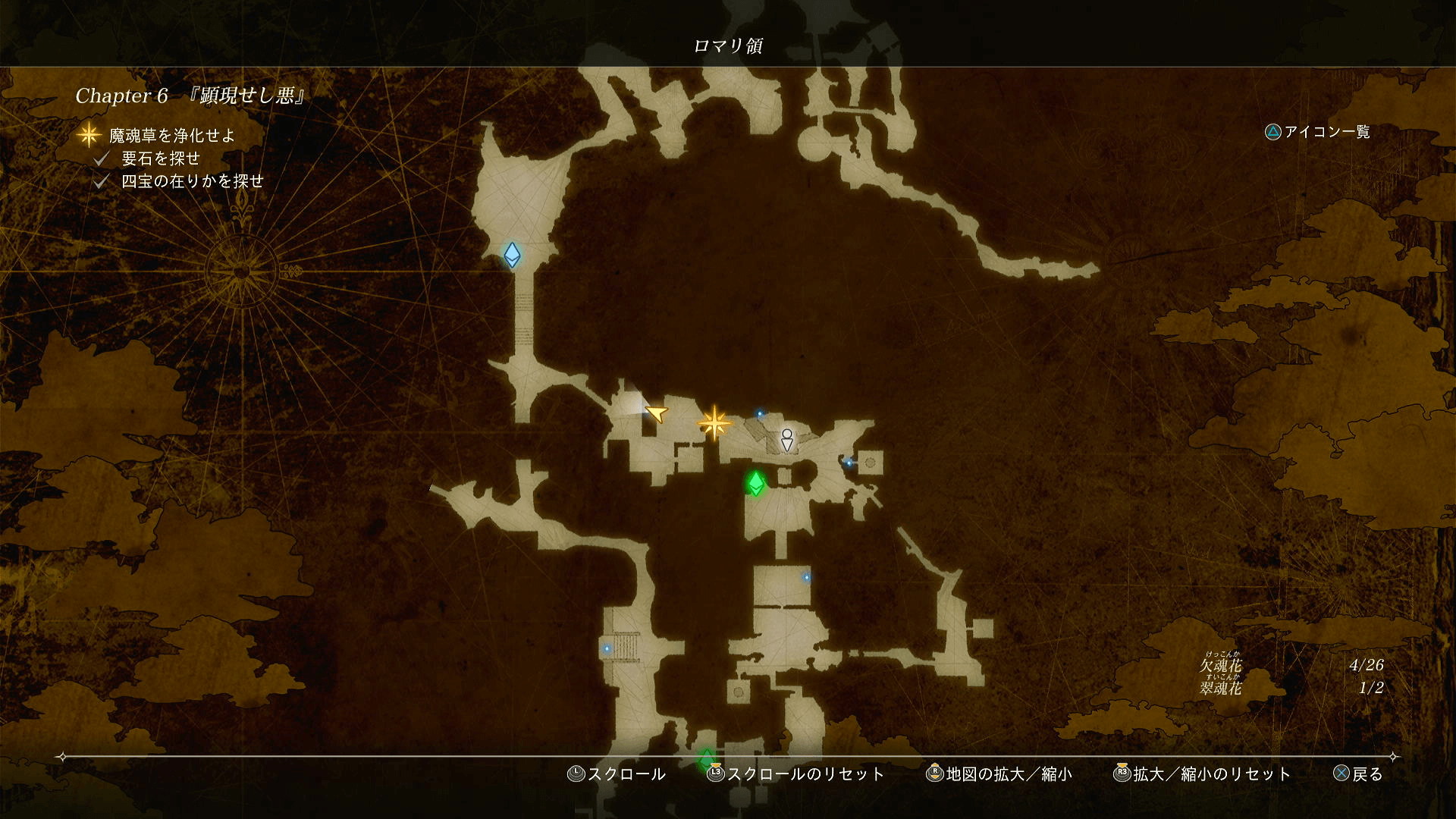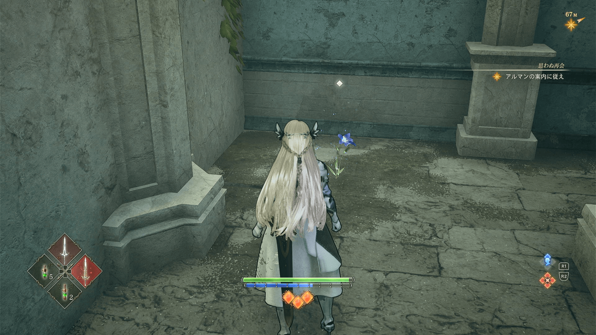 欠魂花とは、各マップに点在する収集アイテムのことだ。欠魂花は青い花の見た目をしており、近づいてL2ボタンを押すと入手できる。