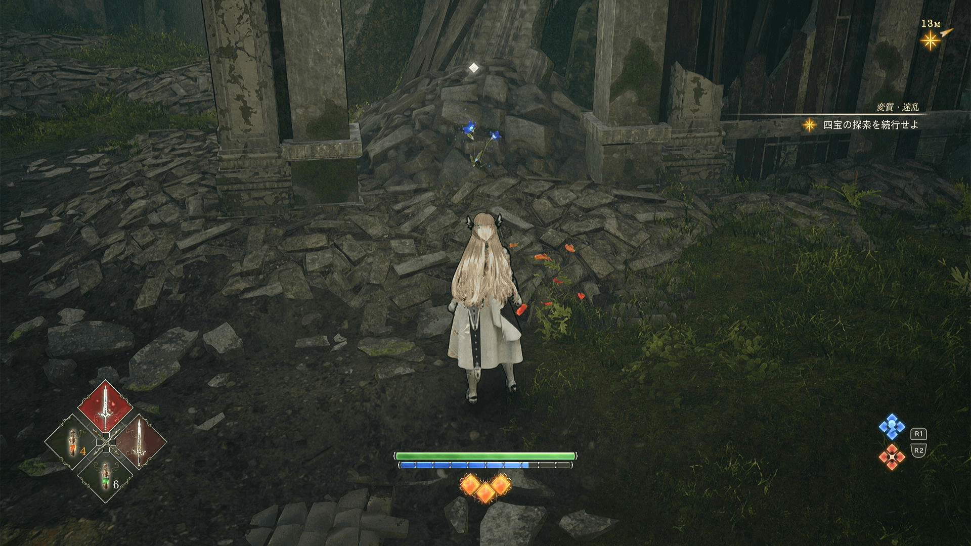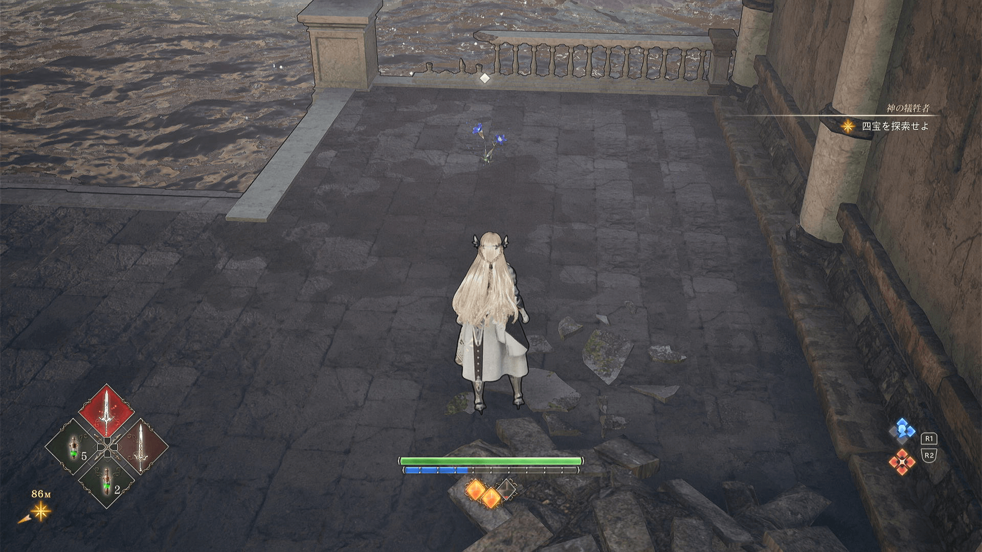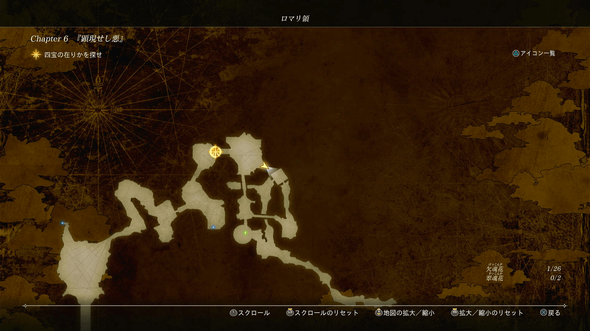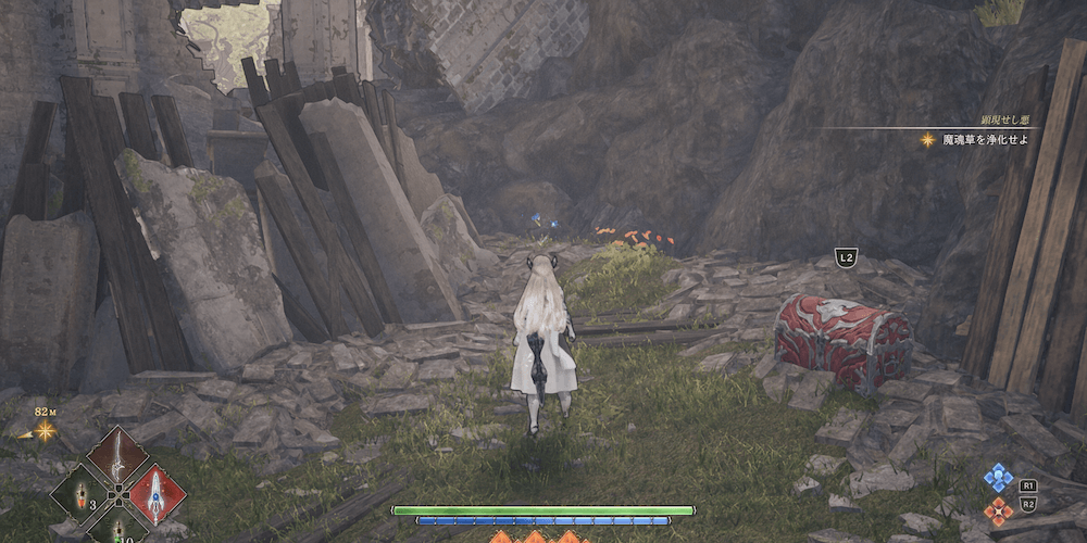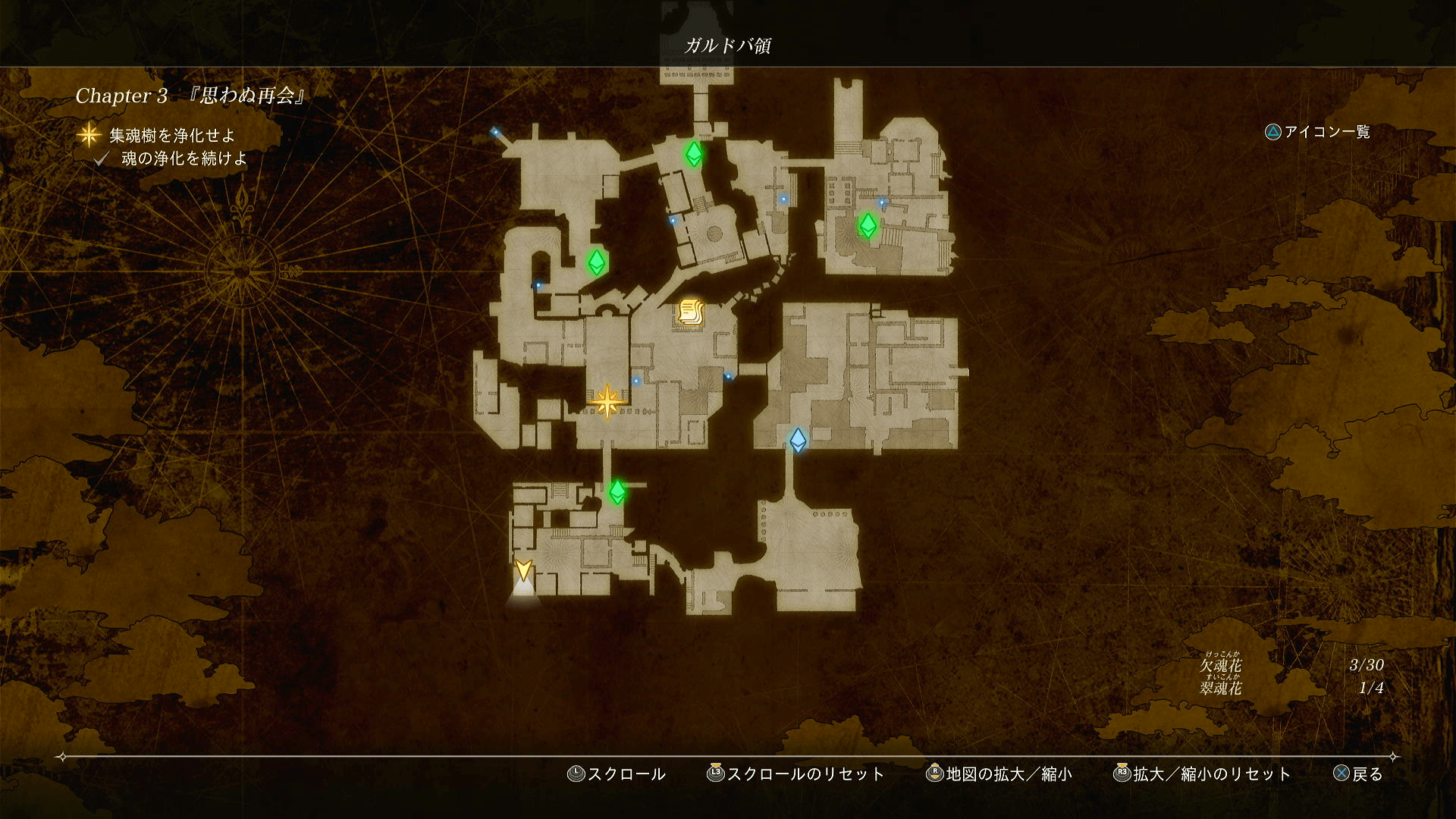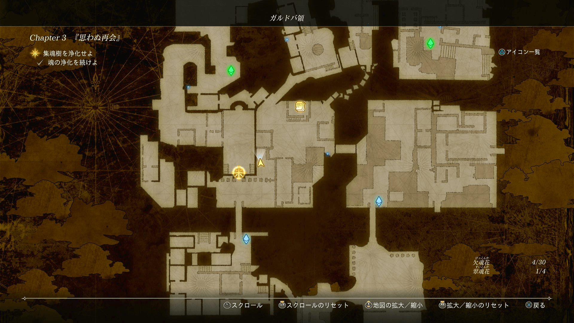 欠魂花とは、各マップに点在する収集アイテムのことだ。欠魂花は青い花の見た目をしており、近づいてL2ボタンを押すと入手できる。