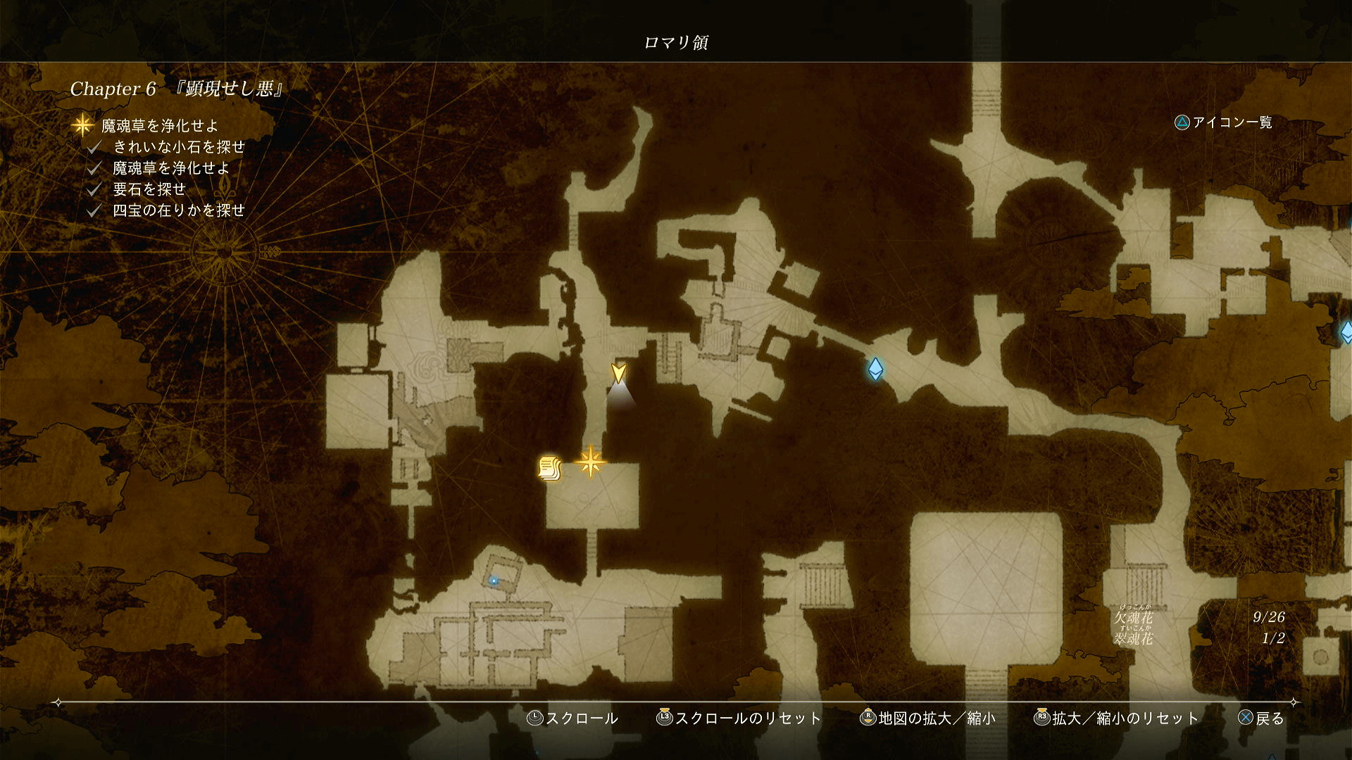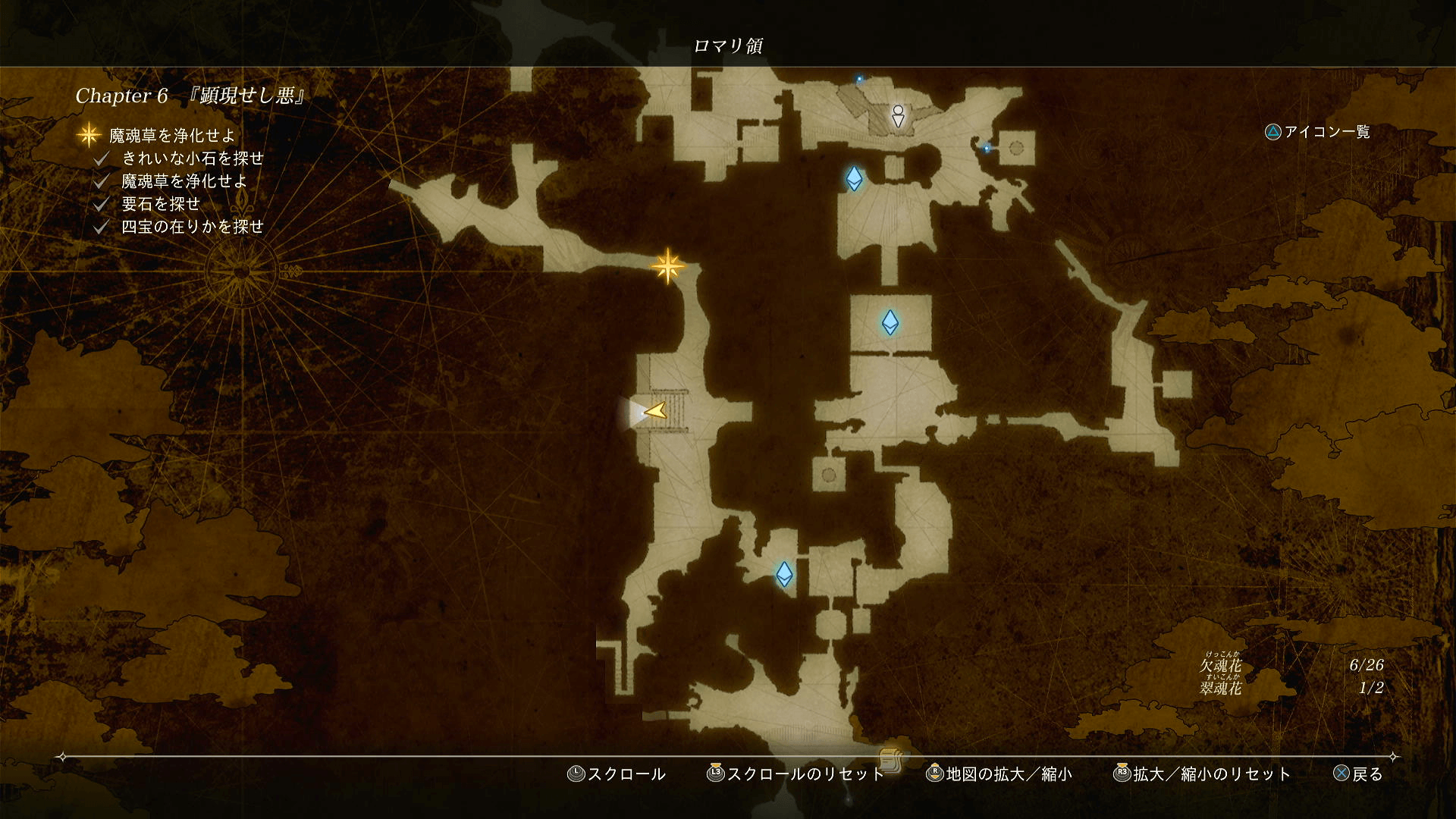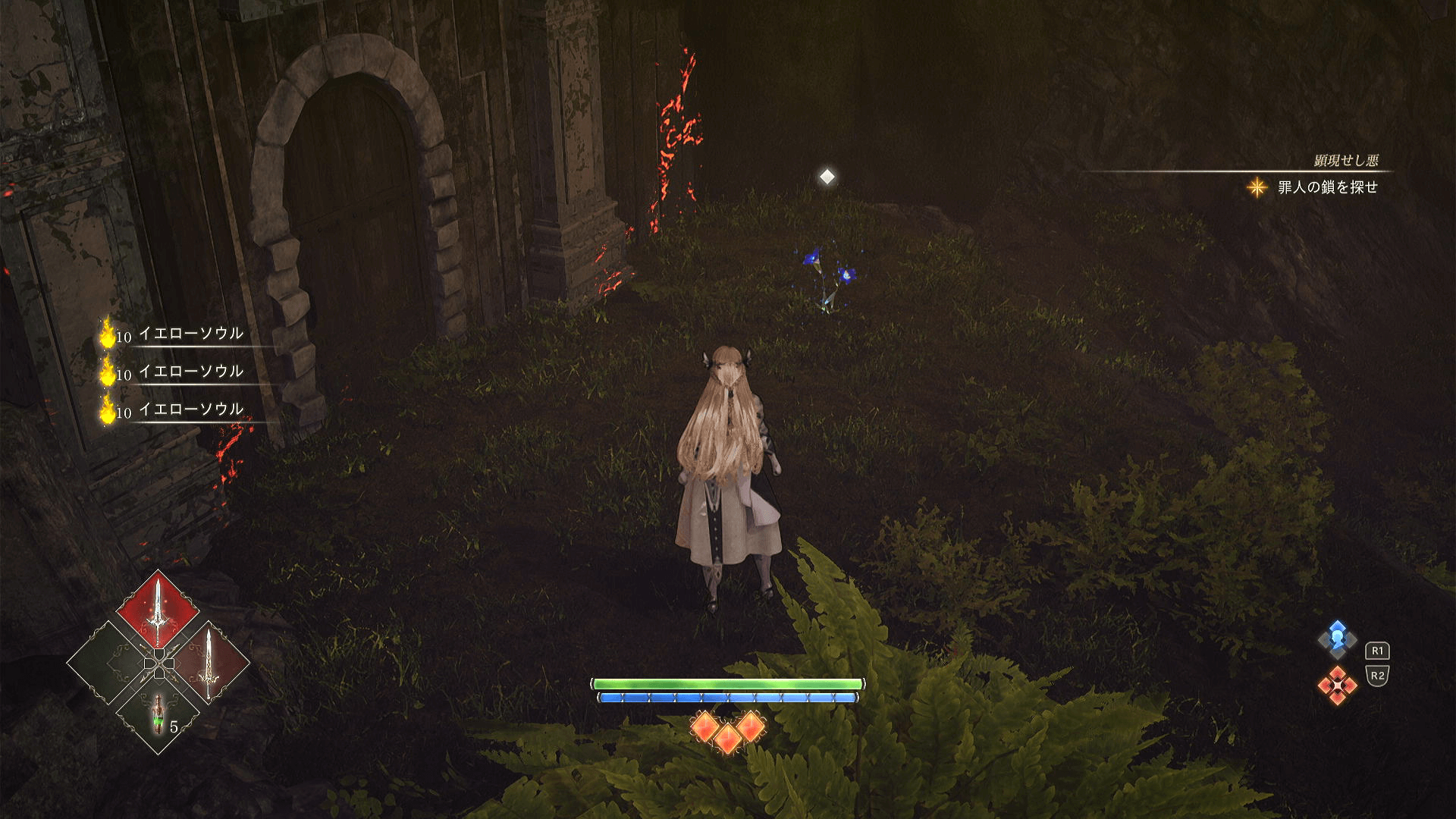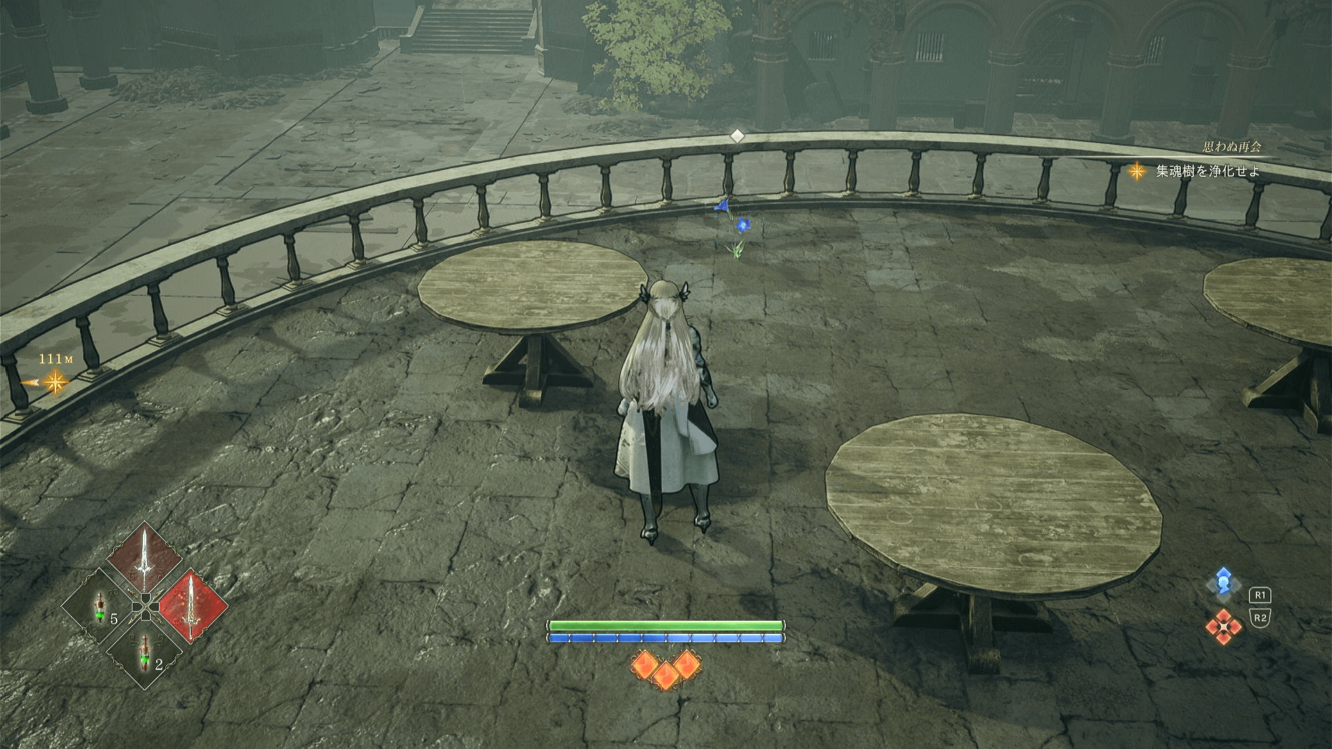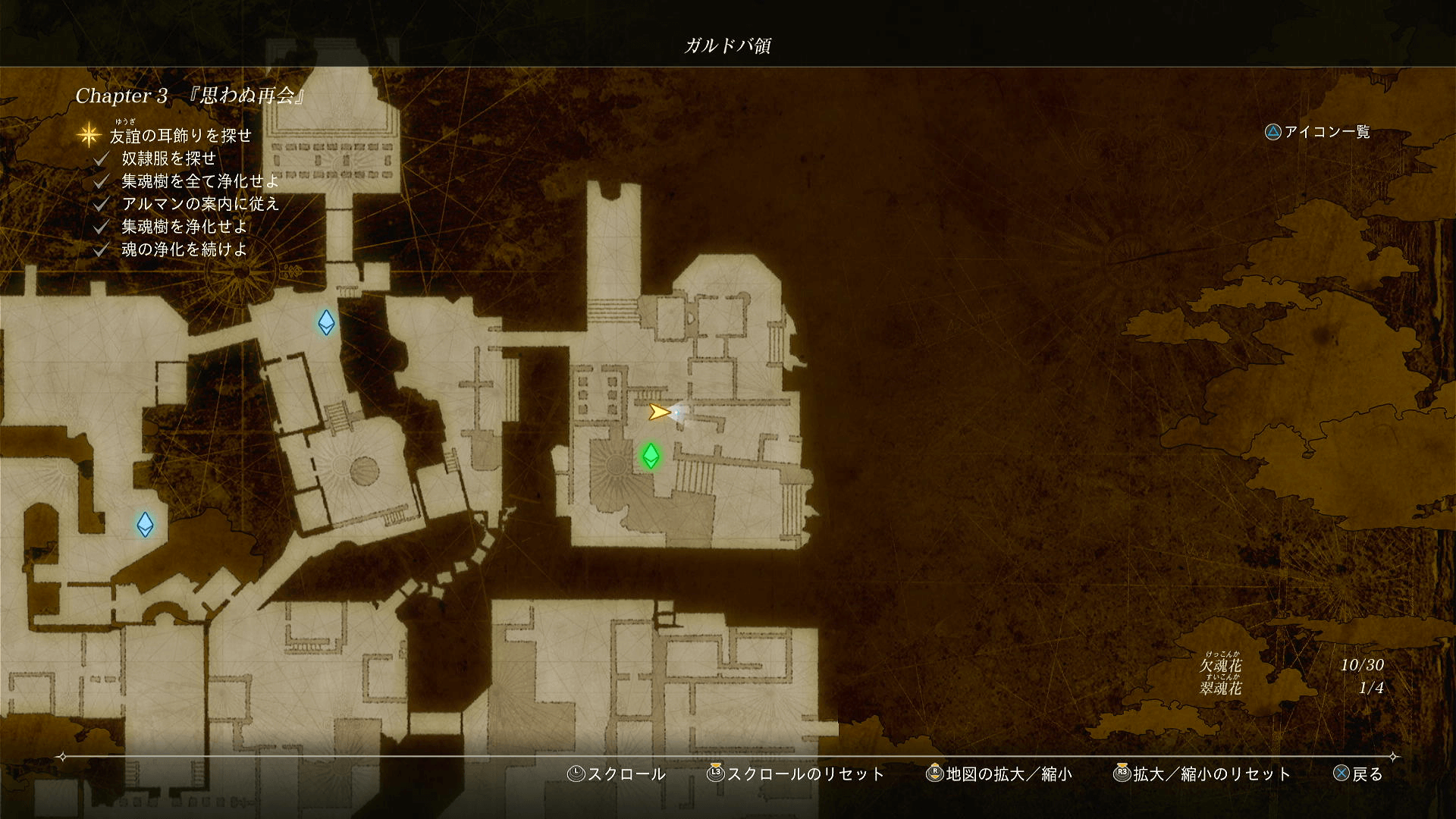 欠魂花とは、各マップに点在する収集アイテムのことだ。欠魂花は青い花の見た目をしており、近づいてL2ボタンを押すと入手できる。