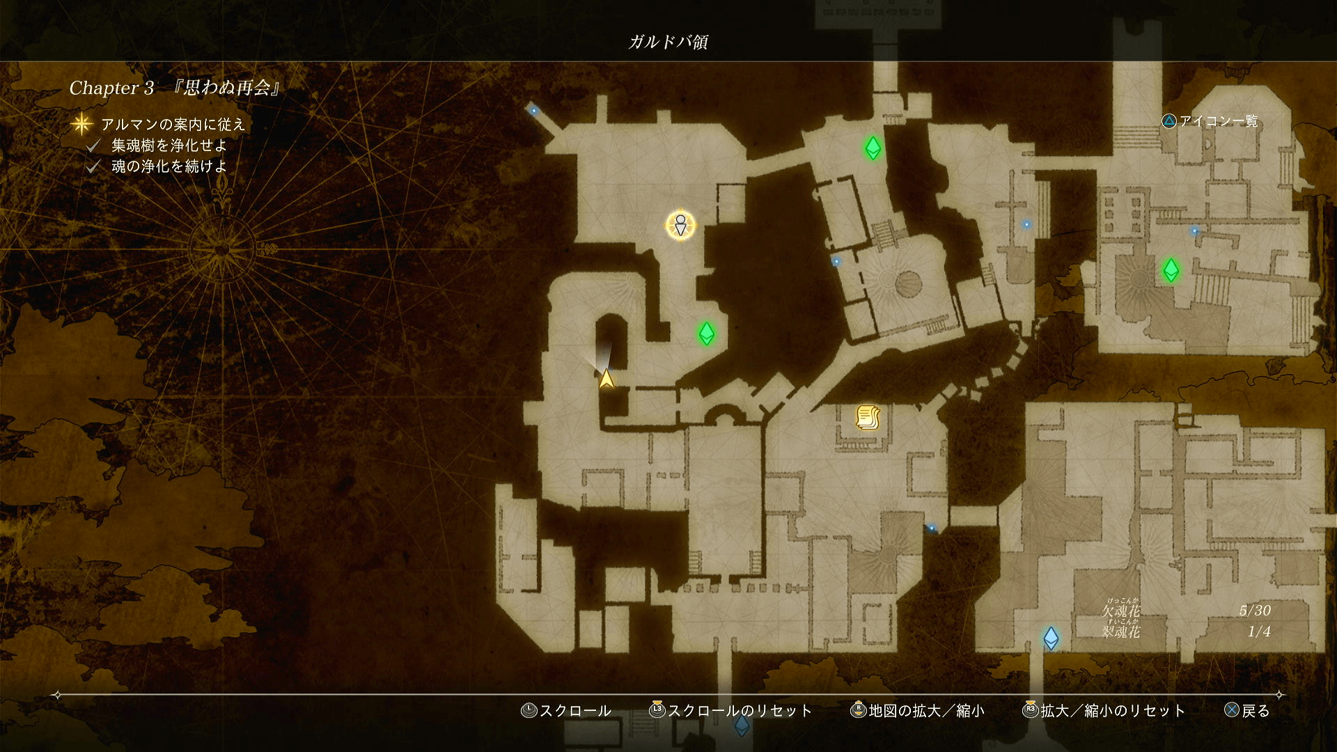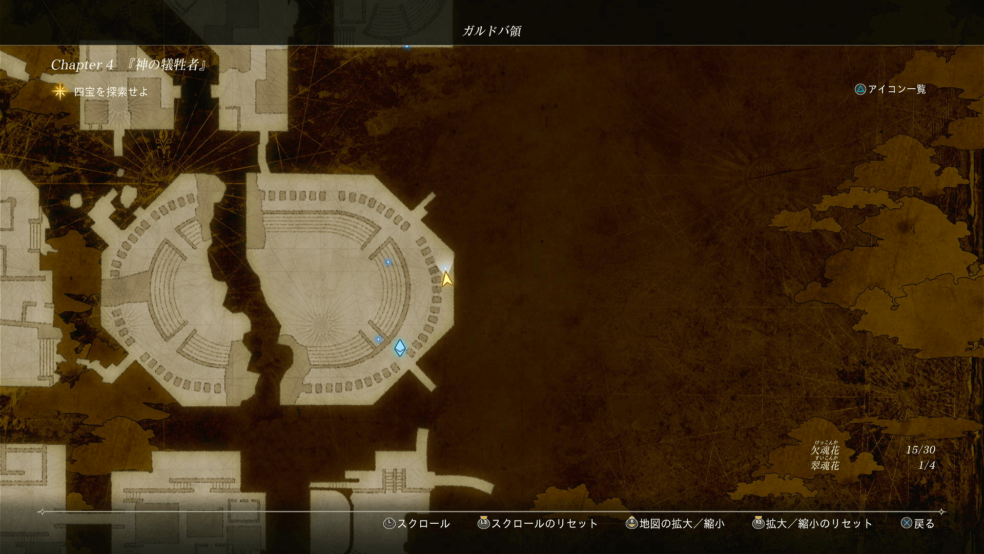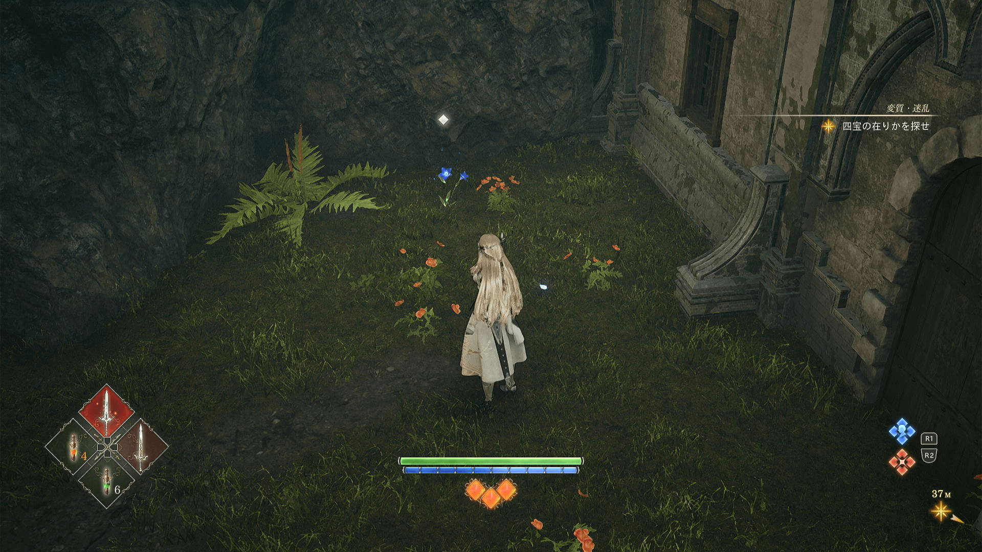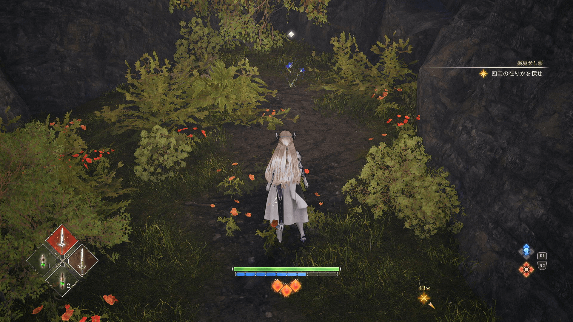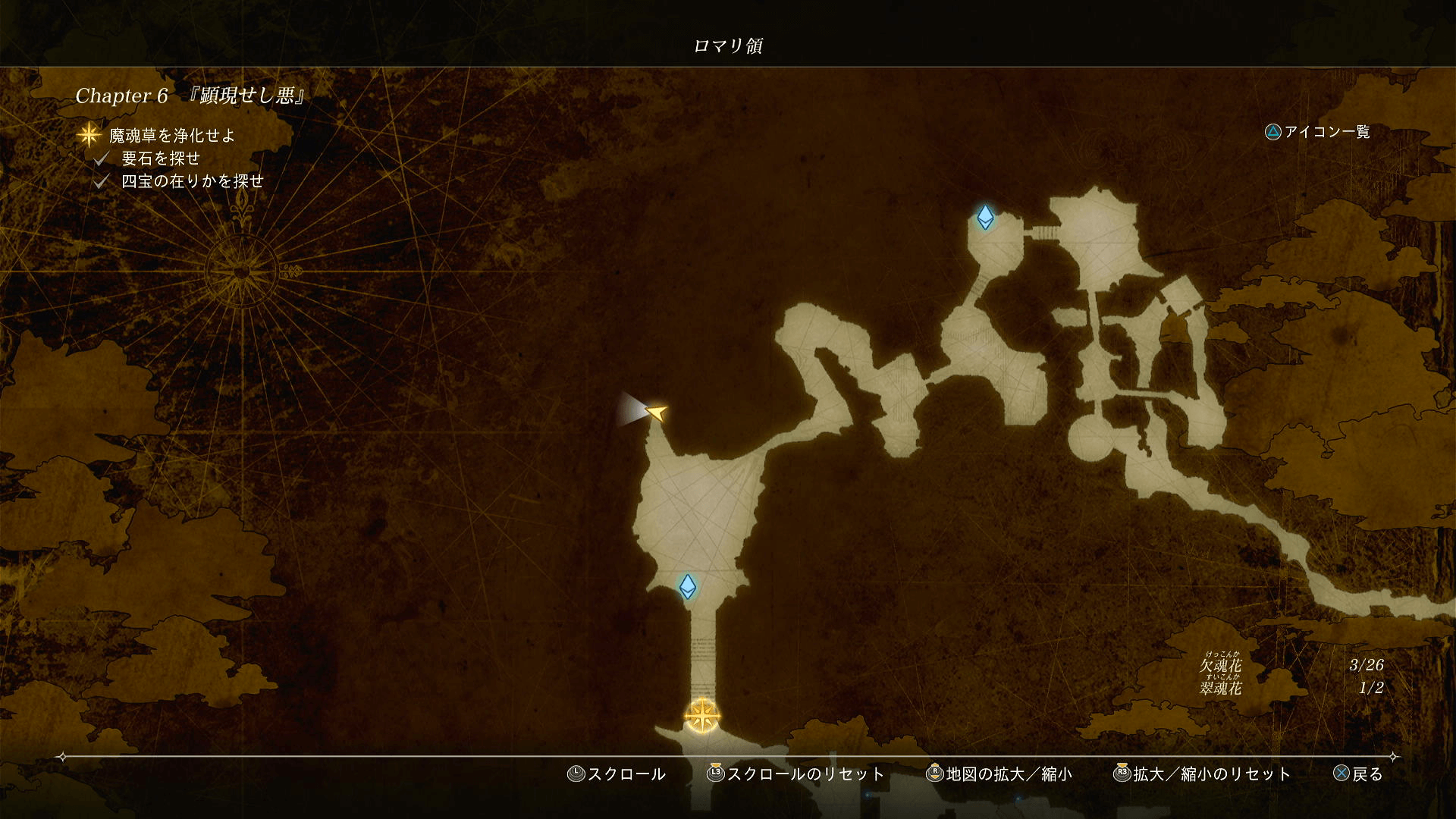 欠魂花とは、各マップに点在する収集アイテムのことだ。欠魂花は青い花の見た目をしており、近づいてL2ボタンを押すと入手できる。