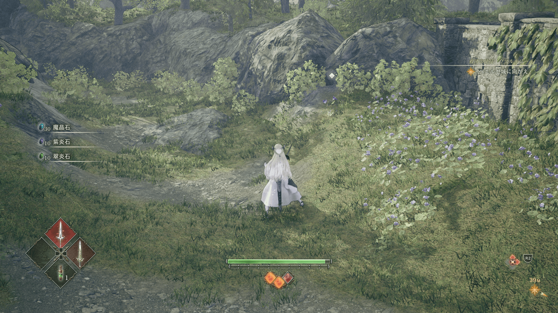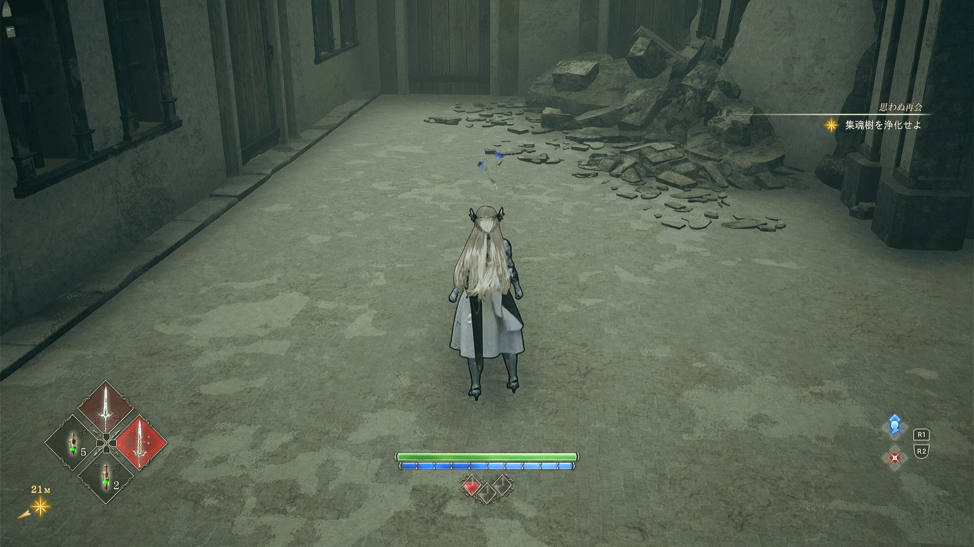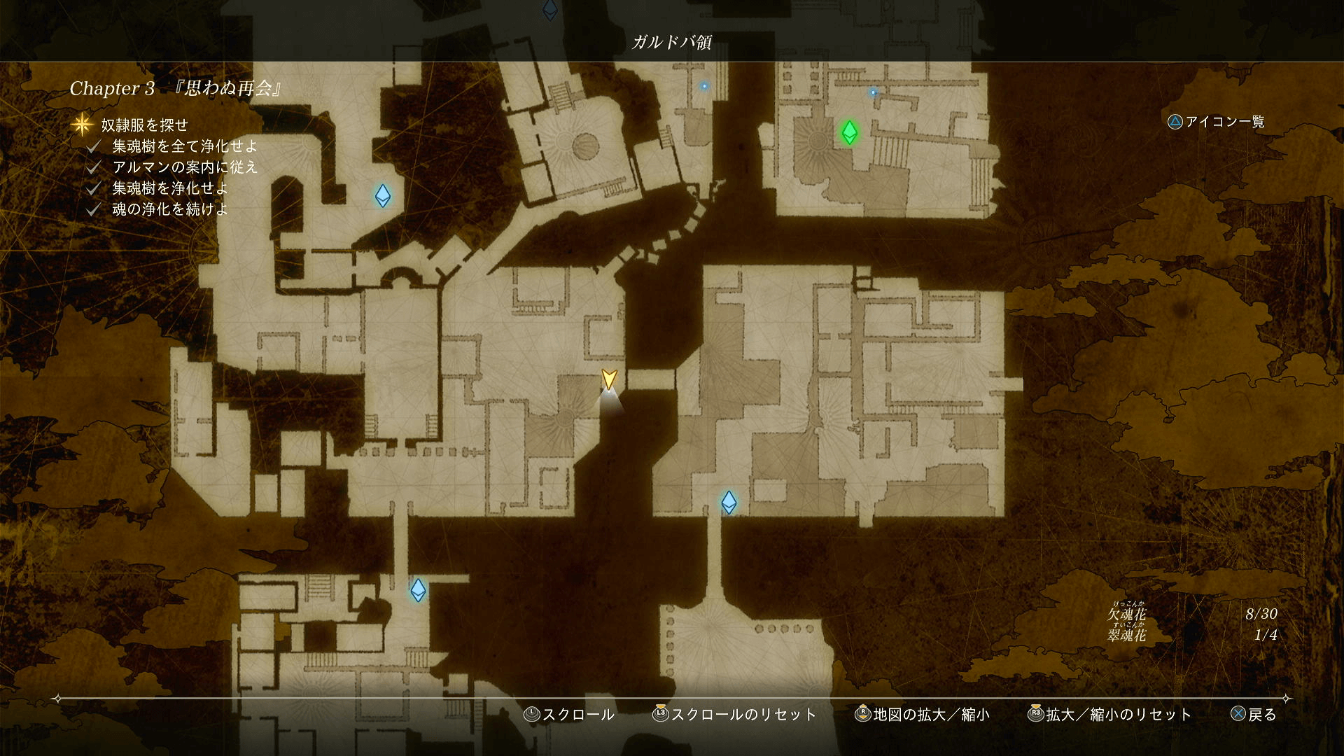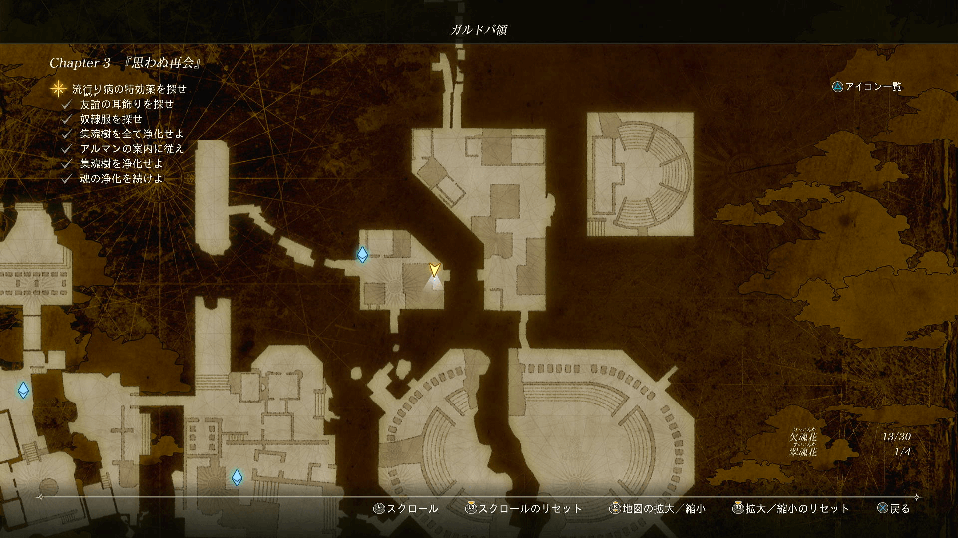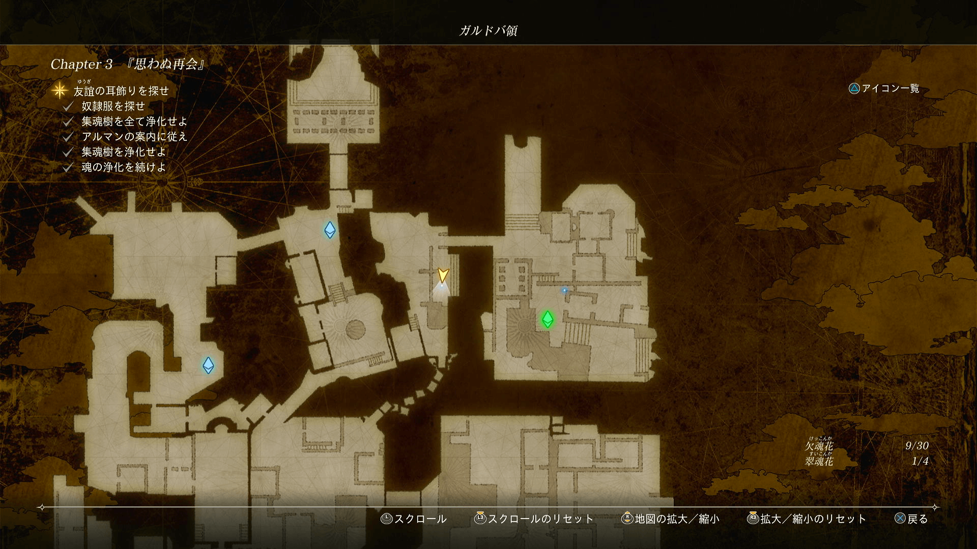 欠魂花とは、各マップに点在する収集アイテムのことだ。欠魂花は青い花の見た目をしており、近づいてL2ボタンを押すと入手できる。