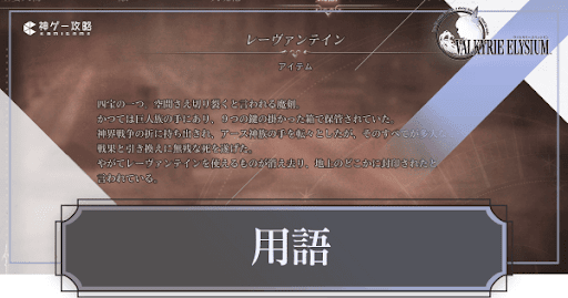 用語とは『ヴァルキリーエリュシオン』専門のキーワードのこと。ゲームの攻略に直接関わるものは無いが、用語の理解を深めることで『ヴァルキリーエリュシオン』の世界観をより楽しめるため、ゲームの休憩中などに確認してみよう。
