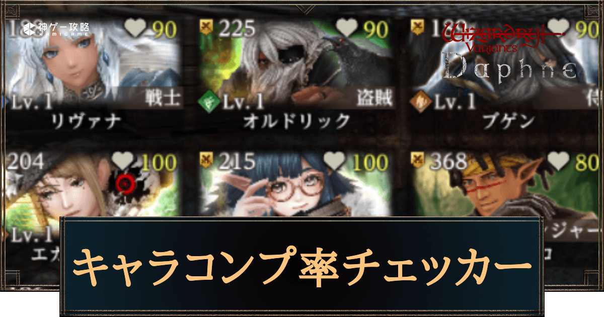 ウィザードリィダフネのキャラコンプ率チェッカーを掲載。実装済みの全キャラのうち所持している割合や体数をチェックできるため、ウィズダフネのキャラの所持率について知りたい際の参考にどうぞ!