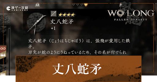 ウォーロン(Wo Long)の丈八蛇矛について解説。丈八蛇矛の性能や入手方法に加えて、揃え効果も掲載しているので、ウォーロンフォールンダイナスティをプレイする際の参考にどうぞ。