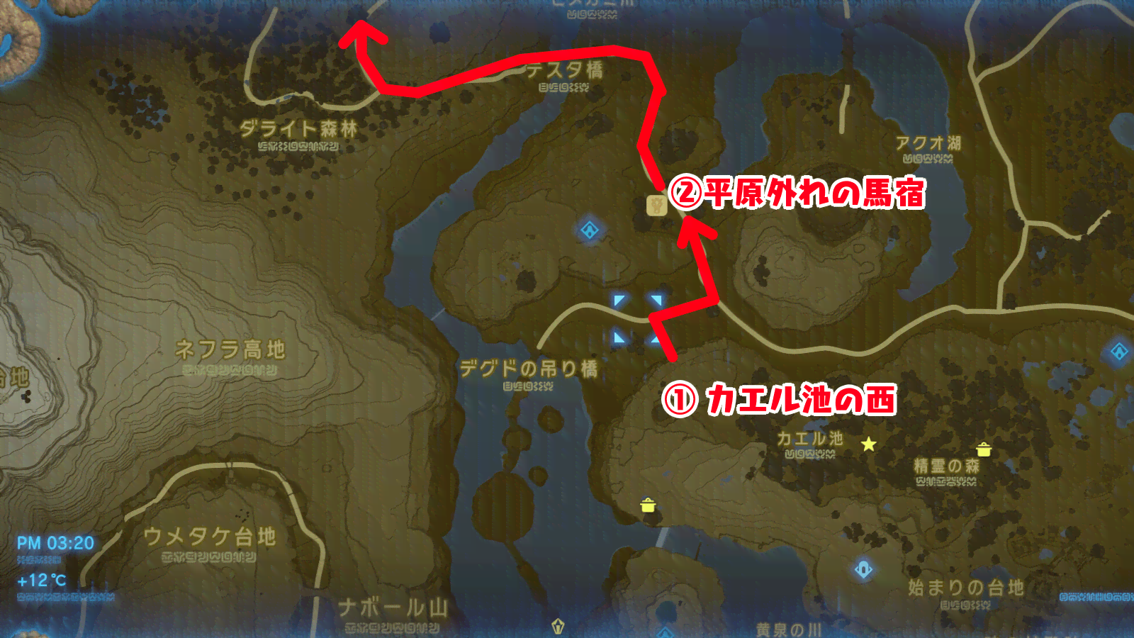| 2 | 街道を西北に進み平原外れの馬宿に立ち寄る┗近くにあるルヨ・タウの祠を起動しておく。 ┗馬を呼び出して北の街道を進もう。 |