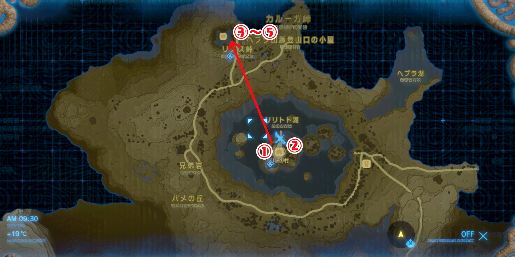 | 3 | 飛行訓練場に向かう┗サキの家からパラセールで向かえる。 ┗リトの防具を着ないと寒さでダメージを受けるので予め装備しておこう。 |