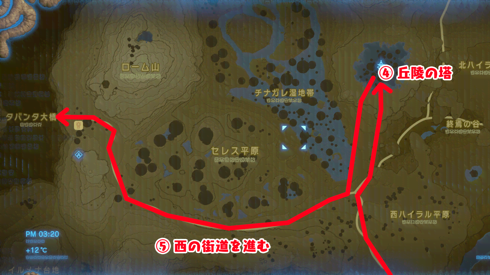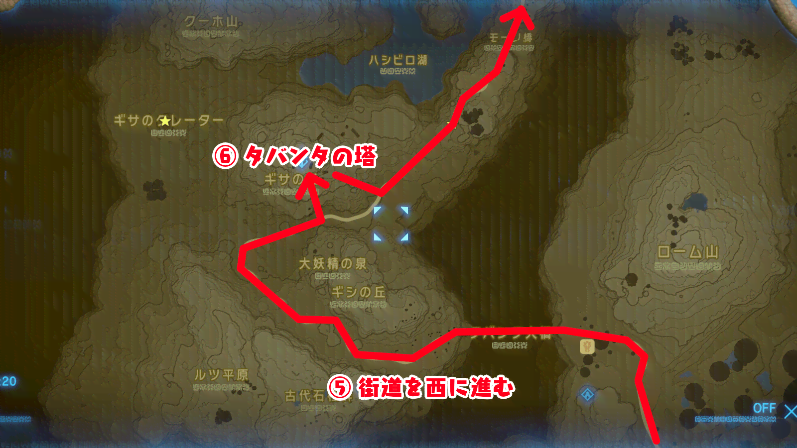 | 6 | タバンタの塔を起動する┗ガノンの怨念(黒い塊)を避けて塔を目指す。 ┗塔のすぐそばにある石柱にある目玉を倒すと石柱が倒れるので、石柱から塔に飛びつこう。 |