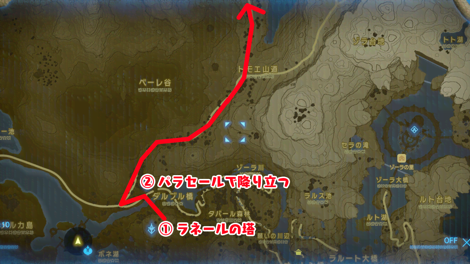 | 2 | ラネールの塔から北側に飛び降りる┗サオ・コヒの祠方面に向かってパラセールで街道へ降りよう。 ・分かれ道が見えるので、北に進む。 |