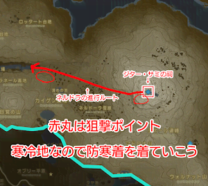 オルドラ、フロドラと同様に弓矢で狙い撃ちしよう。また、ネルドラの出現ポイントは雪山なので、あらかじめ防寒着を着用してハートが減少しないように対策しておく必要がある。