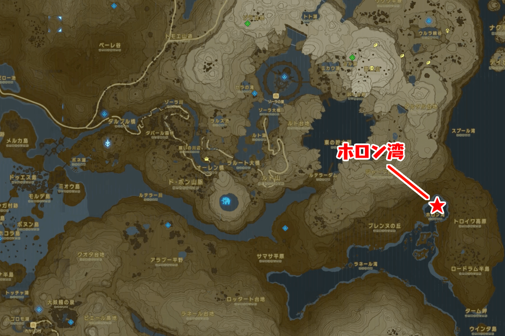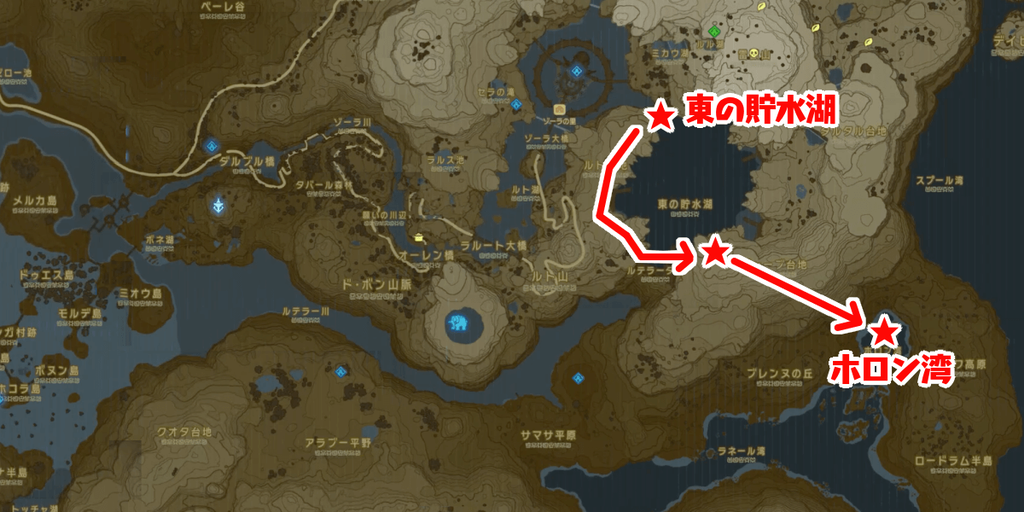 | 1 | ホロン湾に向かう・東の貯水湖の崖から飛んで行くのがおすすめ。 ・東の貯水湖はゾーラの里から行ける。 |