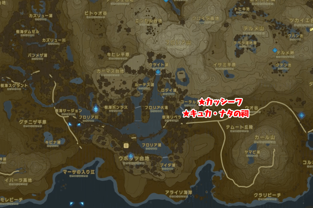 まずは、カッシーワのいるコーラル湖周辺を目指そう。コーラル湖周辺は「稲妻が開く試練」が終わるまでずっと雨と雷なので、滝登りをするかリーバルの猛りで上に向かうのがおすすめだ。
