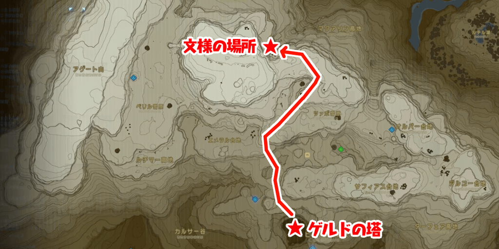 絶壁にある文様は、ゲルド山頂付近にある。ゲルド山頂付近に行くには、ゲルドの塔にワープして徒歩での移動が必要だ。上記を参考しながら、文様のある崖を目指そう。