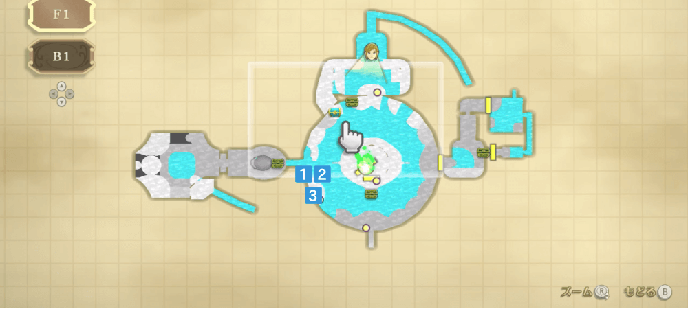ムチを手に入れたら、バルブを回して水の柱を発生させよう。柱の上に乗ると上に行けるので、一度頂上まで行って全てのバルブを解放しておくと良い。解放後は、頂上より下のフロアから大石像のある広場に戻ろう。
