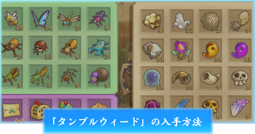 タンブル・ウィードは、ラネール砂漠にいると転がってくるため虫とりアミを使って拾おう。タンブル・ウィードは風が吹くと同時に転がってくるためが、壁にぶつかると消滅してしまう。タンブル・ウィードを集めたい場合は、常に虫とりアミを手に持っておくのがおすすめだ。