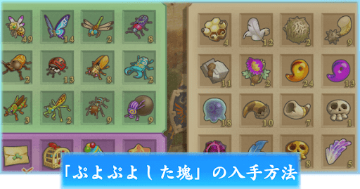 ぷよぷよした塊は、世界各地に出現する「チュチュ」系のモンスターから入手できる。また、「デクババ」系モンスターもドロップする可能性があり、狙わずとも入手している場合もある。