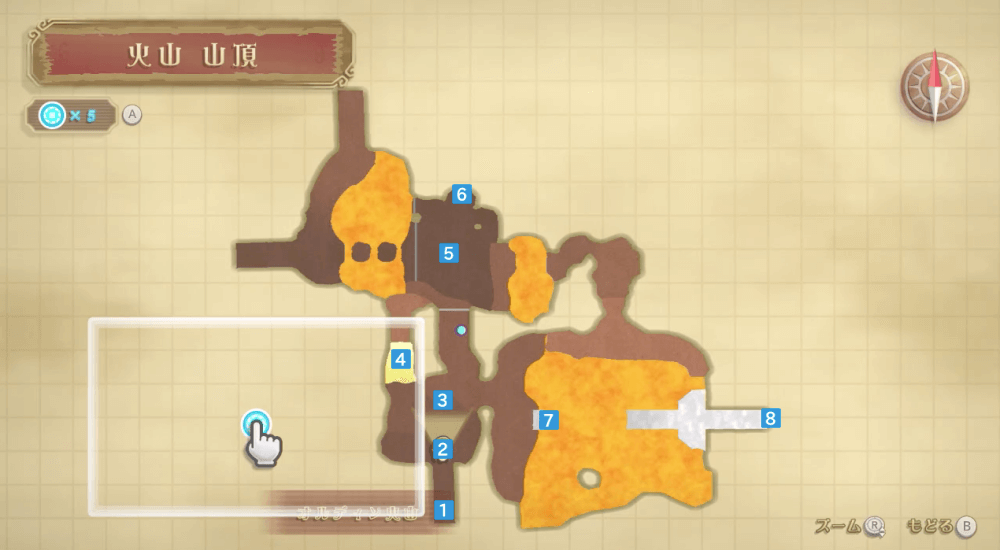 「まほうのツボ」は、東側の高台にある。見張り台の近くまで到着したら、穴を掘って地下に潜り「まほうのツボ」を回収しよう。「まほうのツボ」を回収したら、溶岩を吹き飛ばして更に上の足場へ進むと良い。