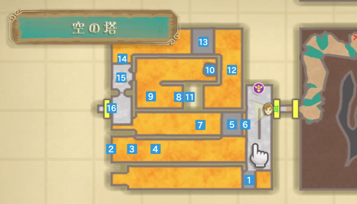 空の塔に入ってすぐの宝箱から「ダンジョンの地図」を入手したら、隣の部屋にある操作盤を調べよう。操作盤では8個の部屋を移動させて、扉同士を隣接させると部屋が繋がる。