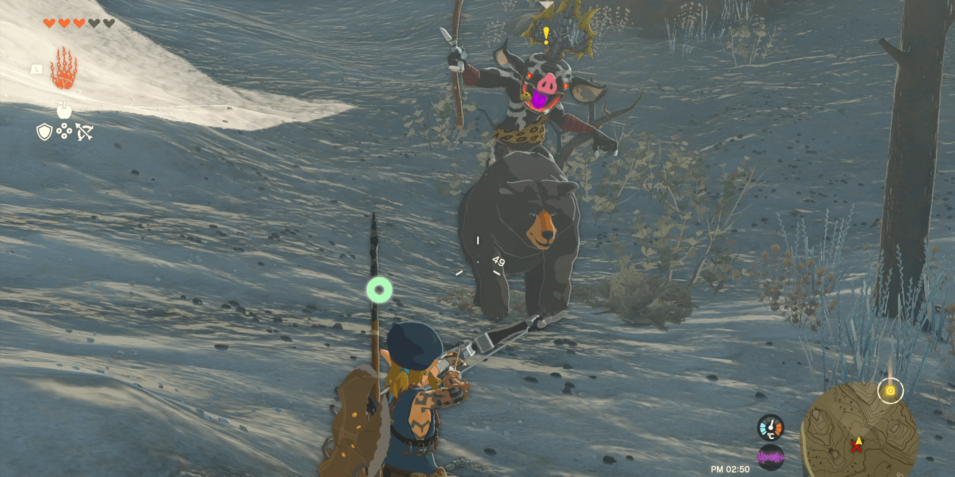 場所 外観 オルディン山脈付近のシククチの祠から北に行き、ライダーボコブリンを見つけたら念のためセーブしておき、下にいるクマだけを矢で狙って倒そう。クマだけを倒したら素材を回収し、セーブとロードすれば復活しているため、繰り返して肉を大量に入手しよう。