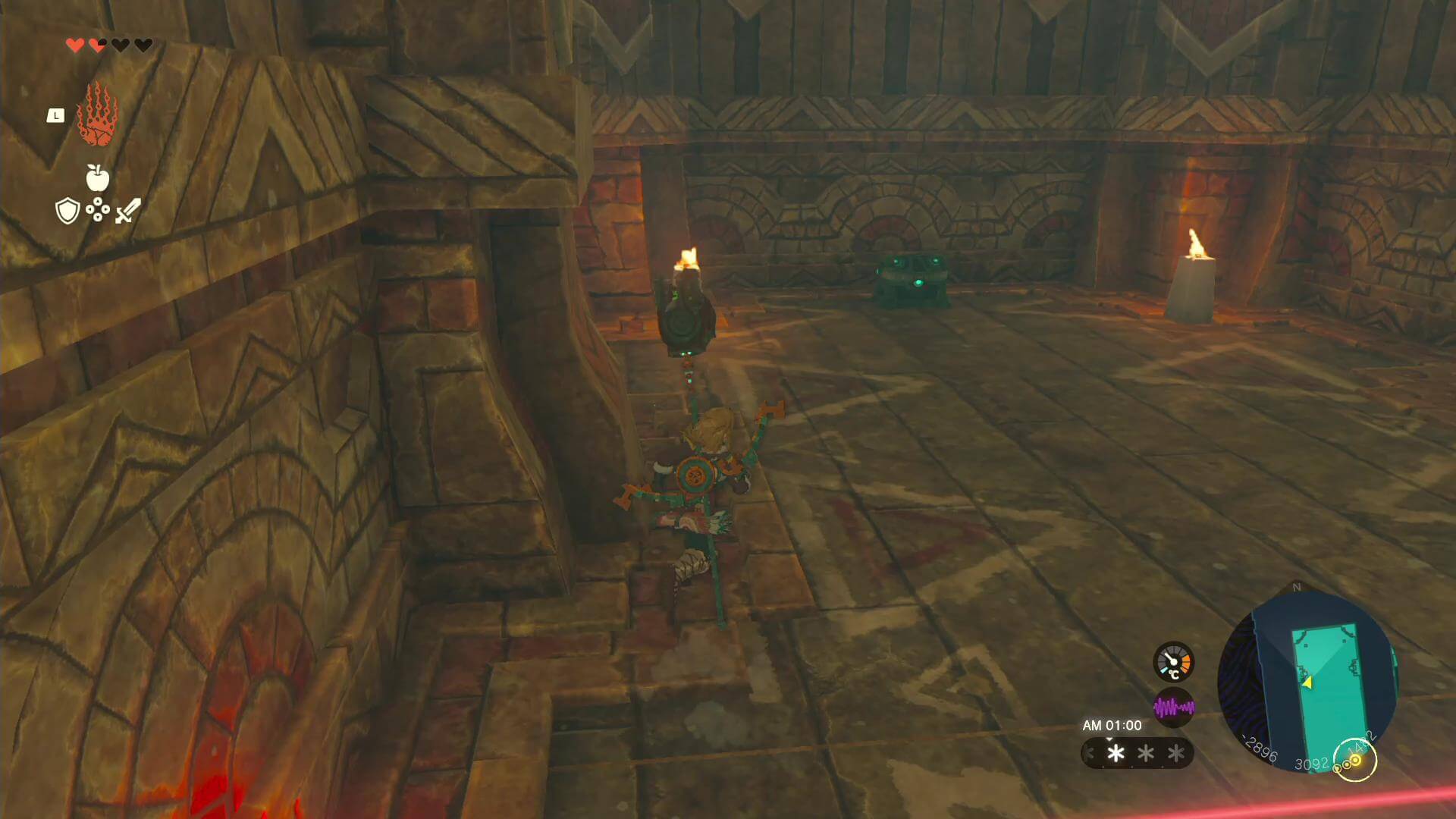 レバーを塞いでいる氷を溶かして、ウルトラハンドでレバーを動かそう。氷は薪や火打ち石を使うか、火炎の実の投てき、ゾヌギアの火龍の頭などで溶かせる。火起こしの道具が無い場合は、壁にある燭台を利用して矢に炎をまとわせると良い。