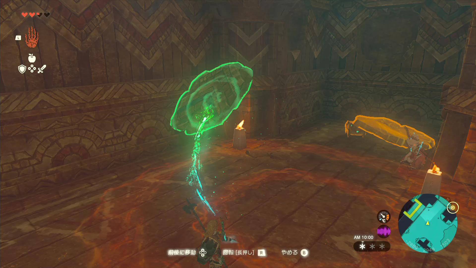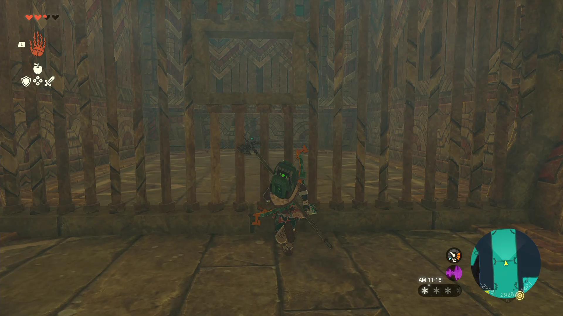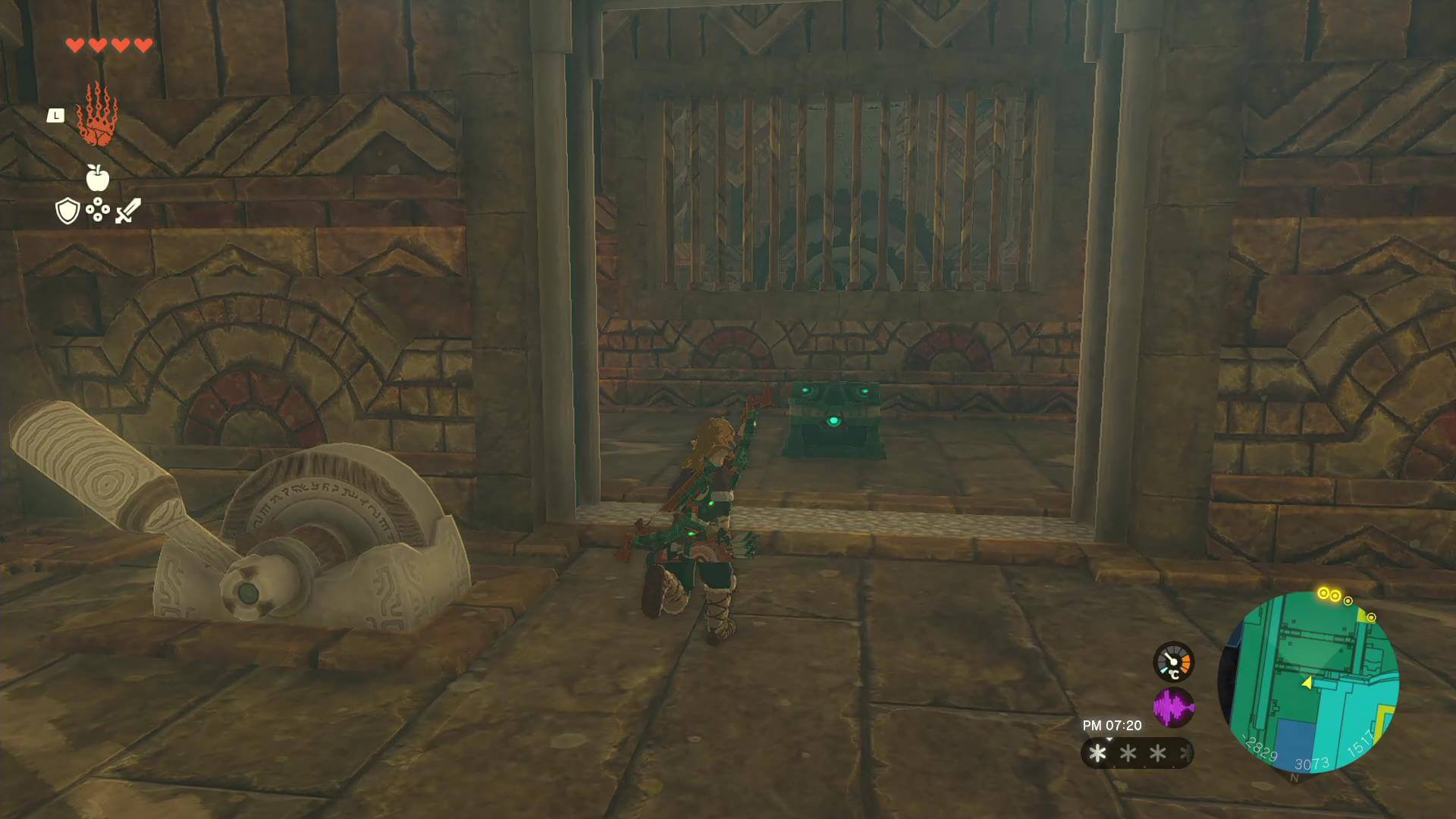 | 3 | 奥の部屋に進み、柵越しに見える鍵①にチューリの風を当てて起動する「風の神殿入口」から北に進み、ウルトラハンドでつららをレバーに接着して鍵①に向かってもOK |