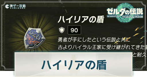 「ハイリアの盾」は防御力90と作中最強クラスの防御性能を有しており、さらに耐久値が高く非常に壊れにくい。最序盤から入手できる盾とは思えないほど強力なため、パラセール入手直後にぜひ拾いに行こう。