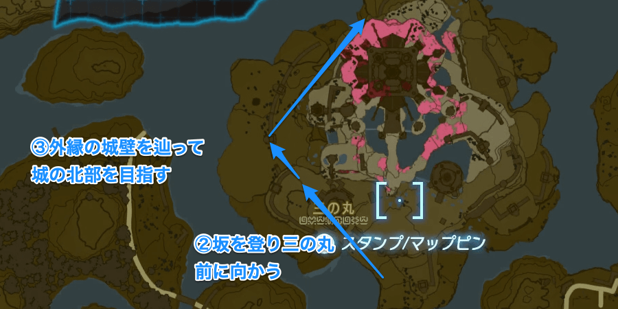 城門付近に着陸できたらメインチャプターでホスタに話しかけに行った際の坂道を登り、三の丸の手前辺りから西側の城壁外縁に向かって飛ぼう。城壁の上に乗って北側に進めば、敵や高低差を気にせず楽に船着き場を目指せる。