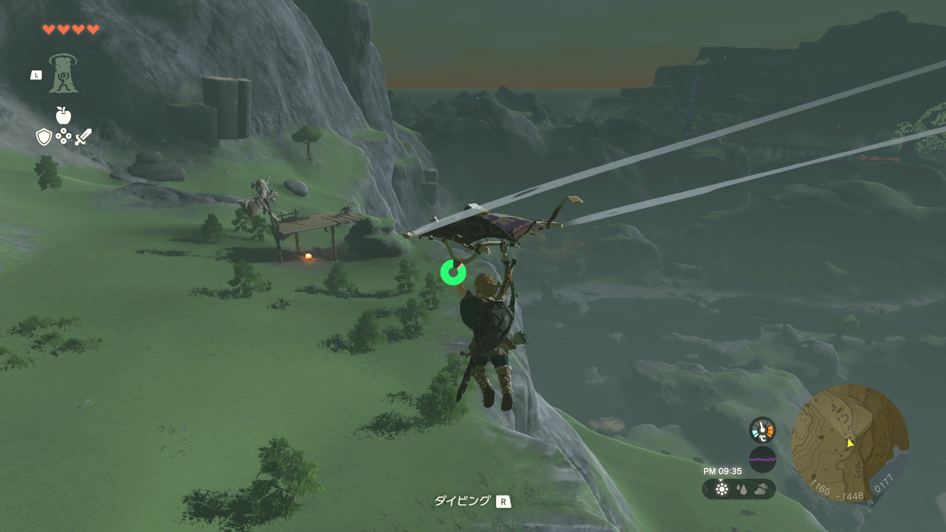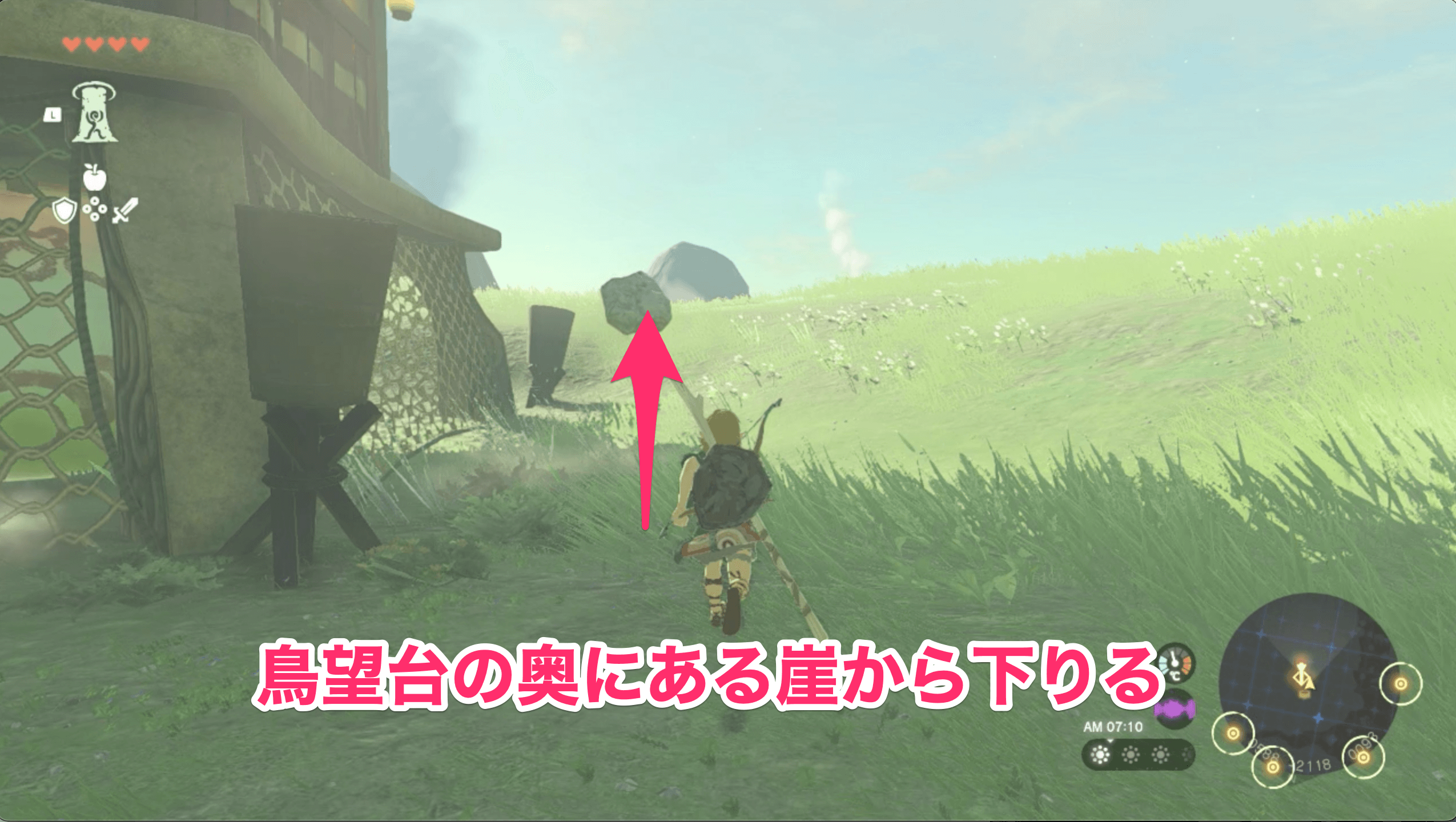しばらく南西へ向かって飛んだら、ボコブリンの砦を目印に高台へ下りよう。砦のボコブリンを相手してもメリットは少ないので、見つかったらすぐ離れると良い。高台に着いたら、足場がなくなるところまで進もう。