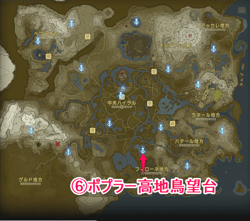ポプラー高地鳥望台は、始まりの空島にある「ナチョヤハの祠」にワープし、パラセールを使って南東方向へ飛び降りると簡単に到着できる。がんばりゲージが少なくても十分に届く距離なので、地上での移動が面倒な場合は始まりの空島からパラセールで向かおう。