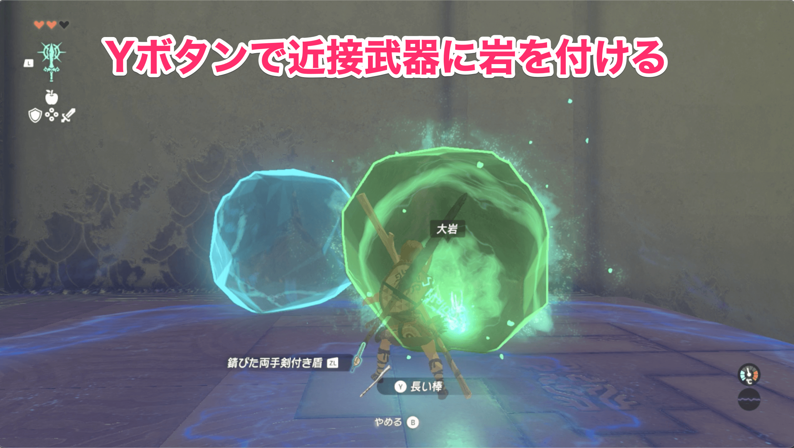 スクラビルドを入手済みで付近に素材があれば、手元の武器と岩を組み合わせて斧やハンマーを作成可能だ。木の棒や剣に「岩」をくっつければ斧に、「大岩」をくっつければハンマーになる。