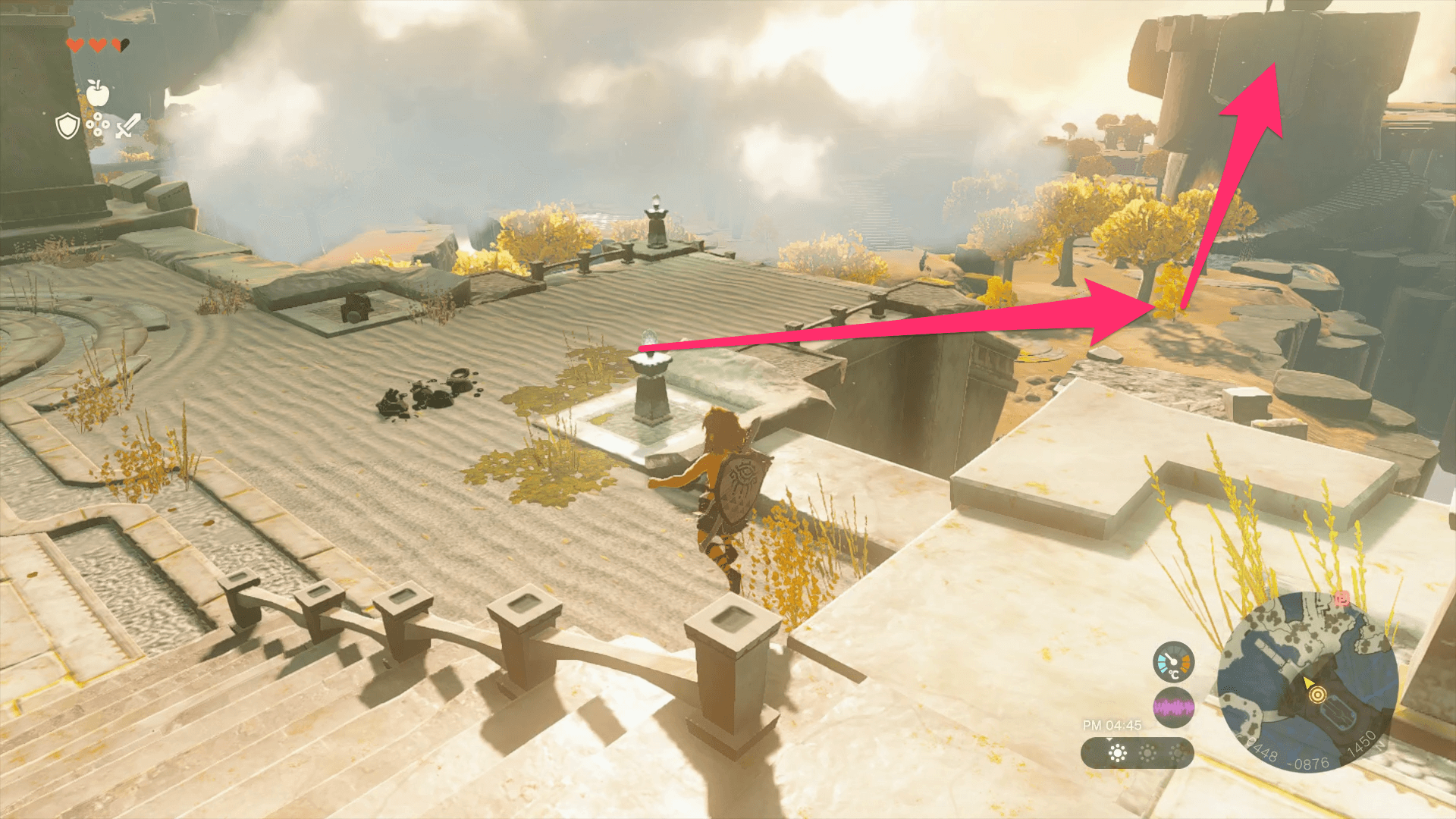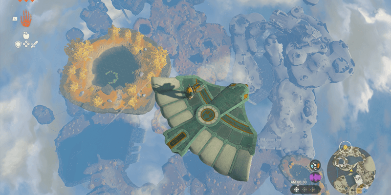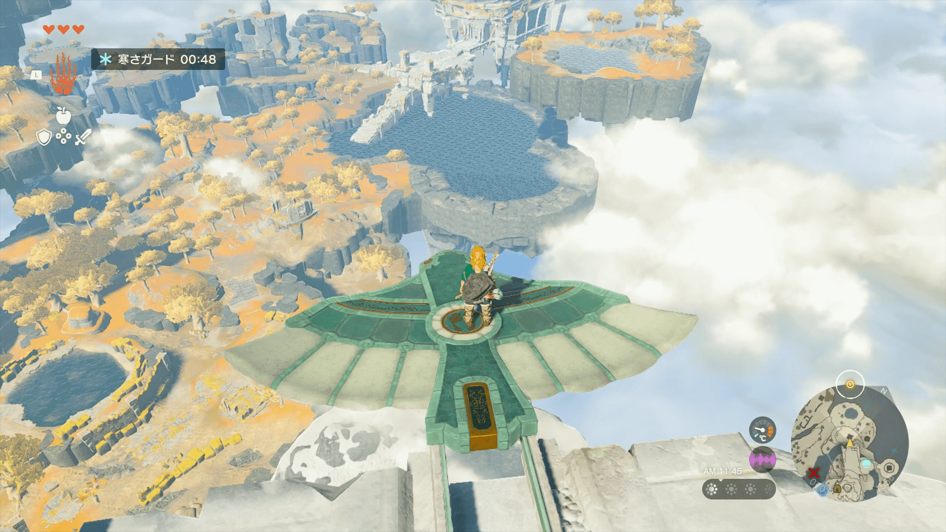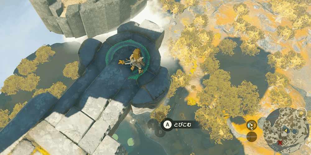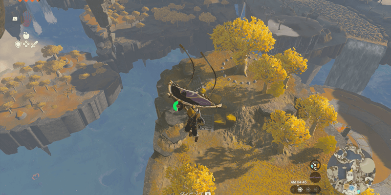 始まりの空島は大量の浮島からなるマップだ。浮島から落下して奈落に落ちるとハート1個ぶんのダメージを受けるうえ、着地地点が地面だと落下死する可能性もある。「パラセール」入手までは浮島から落ちないように注意し、高所から落下する際は必ず水面に飛び込もう。