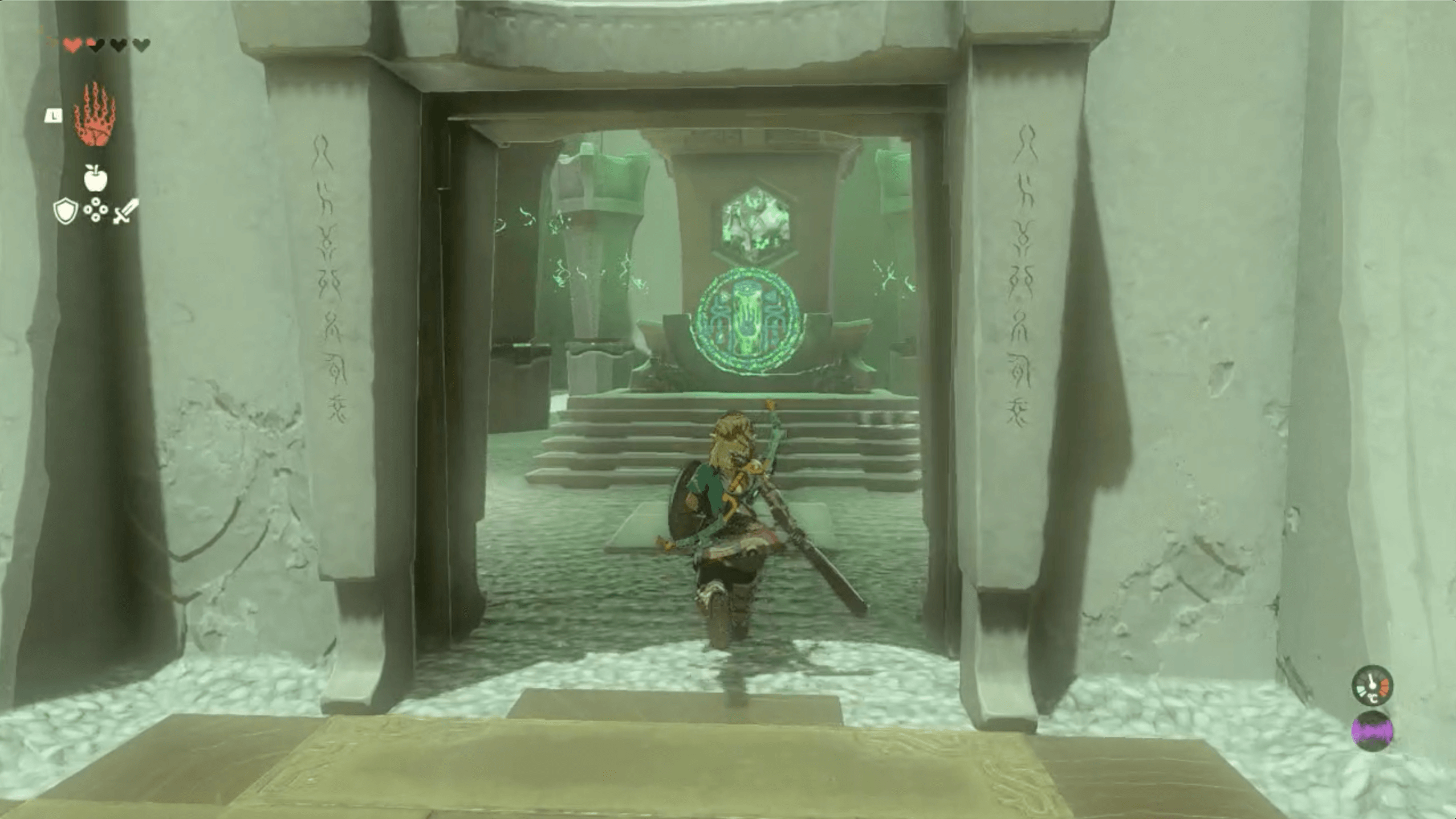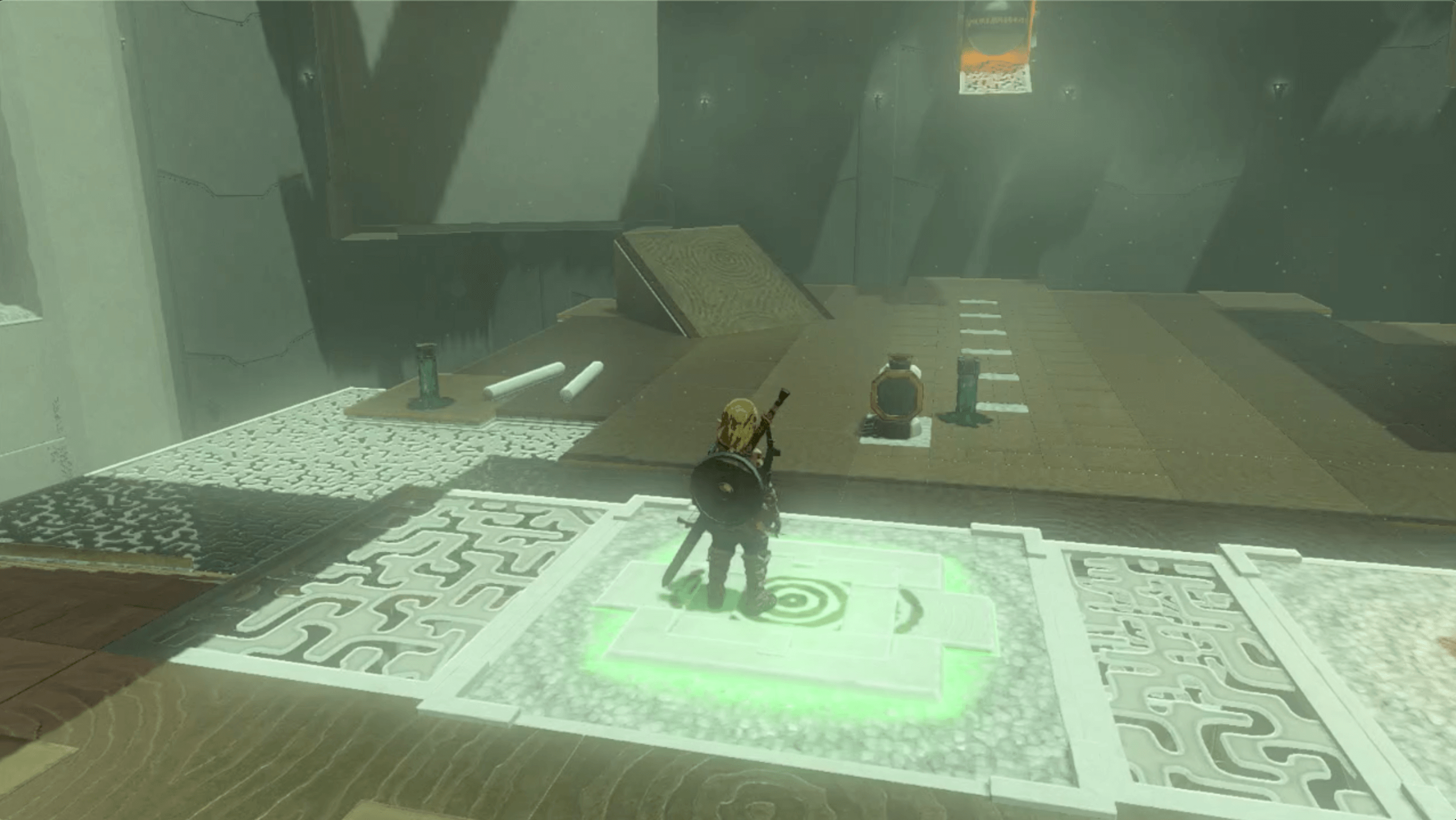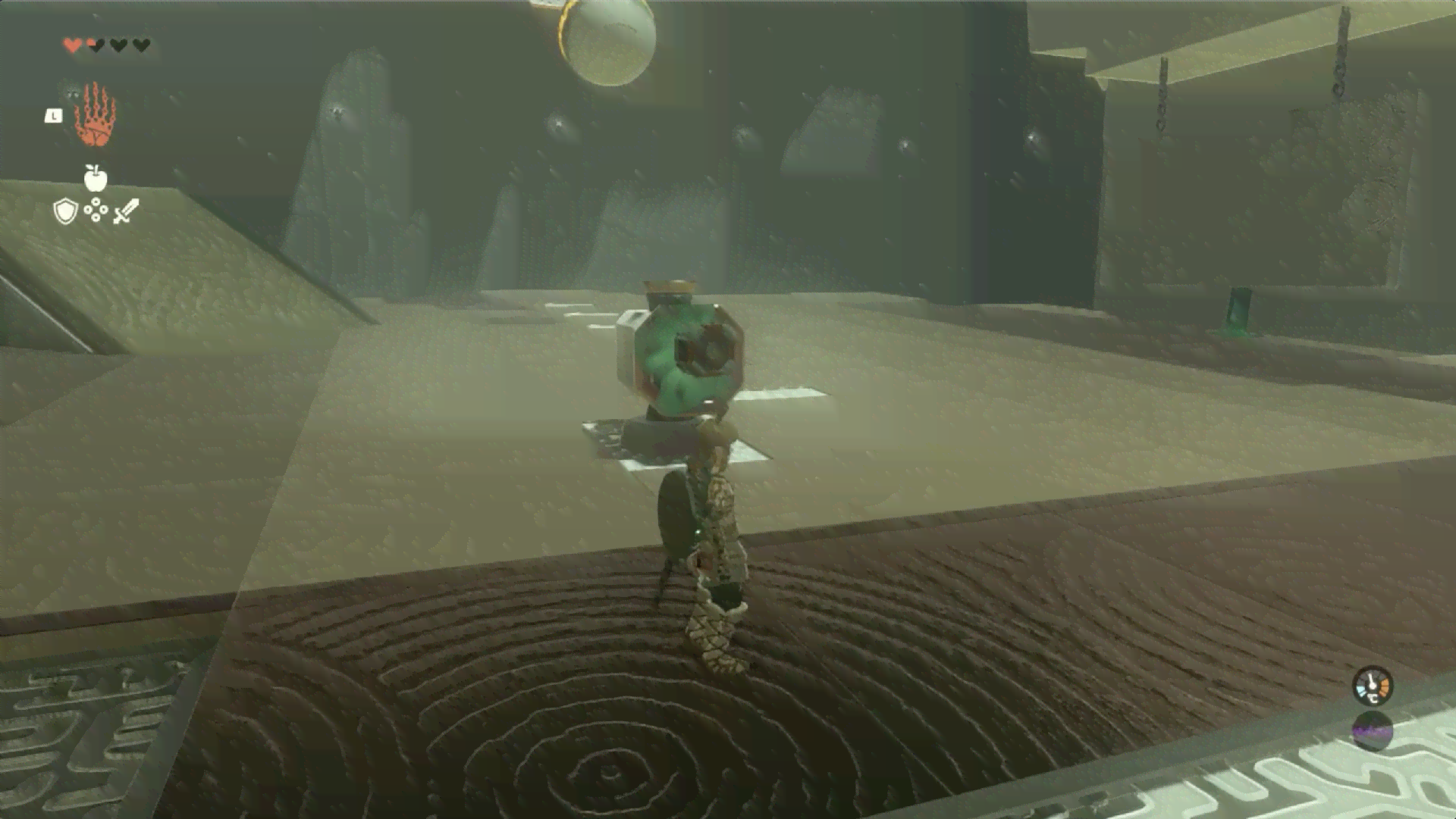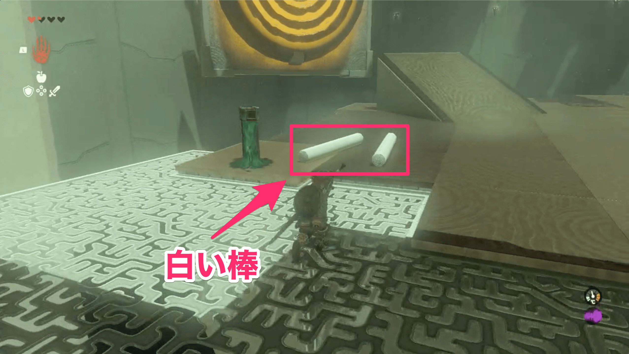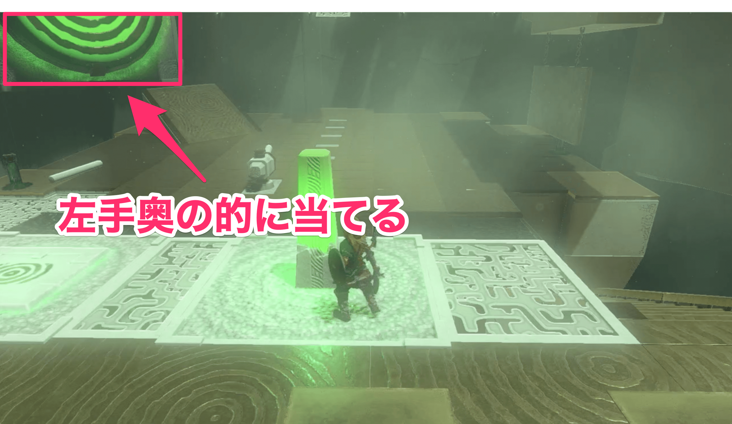 マヤチノウの祠に入ったら、反時計に回っている台に乗って先に進もう。向こう岸に着いたら、少し進んだ先にある左側のスイッチを踏もう。スイッチを踏むと左奥の壁が裏返り、的が現れる。