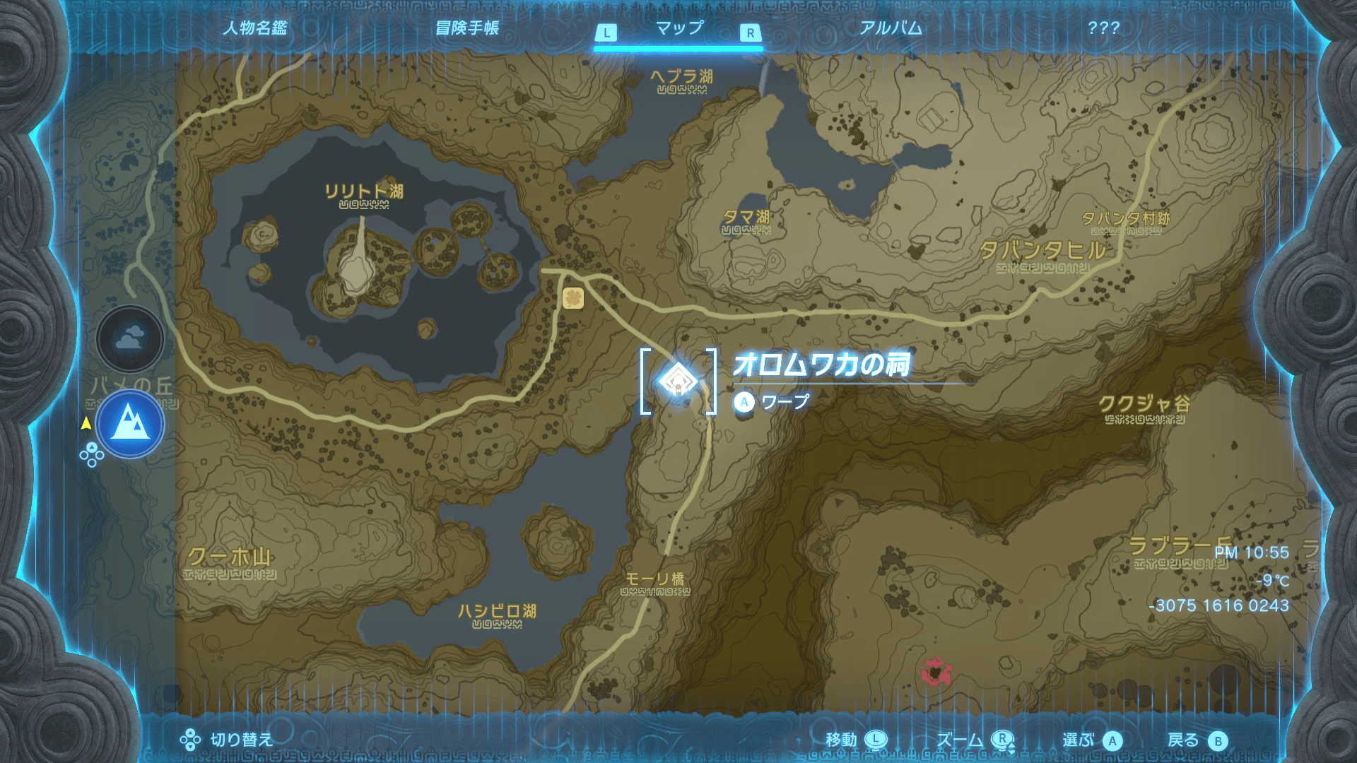 「オロムワカの祠」へは、近くの「カルーガ峠鳥望台」から大ジャンプすると最短で行ける。また、オロムワカの祠は雪が降っていて視界が良くなく、近くに寄るまで目視できない。ジャンプする前にマップにピンを刺しておくと、飛んで行く方向が分かるため、たどり着ける。