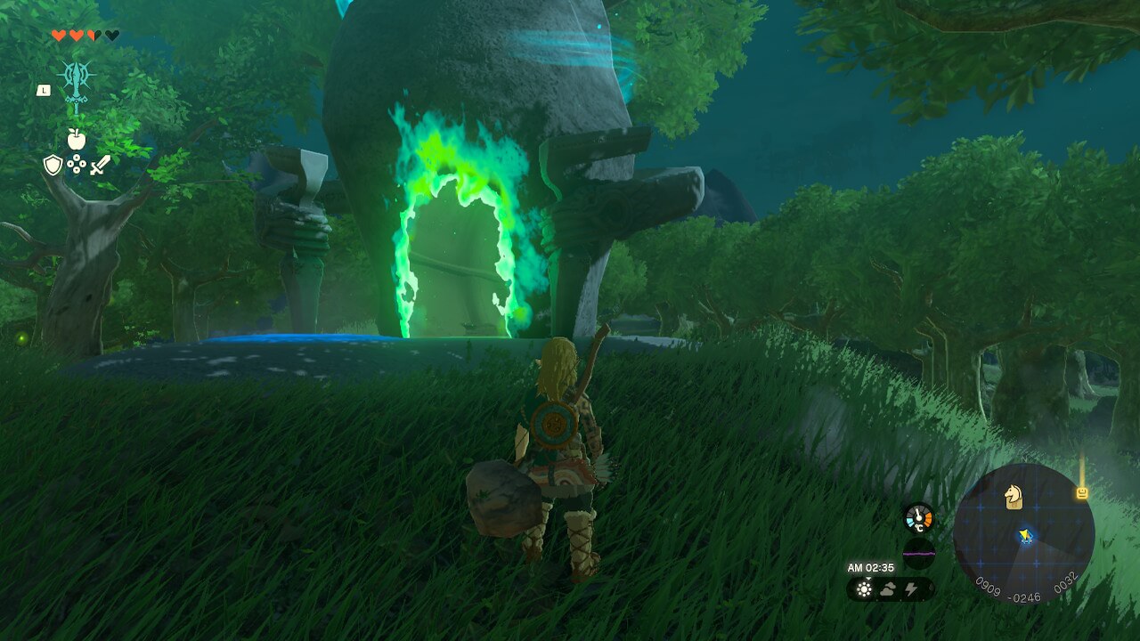 ツカロクの祠へは、監視砦から南東方向にある湿原の馬宿を目指して進むと行きやすい。鳥望台から跳躍して滑空するのが最も簡単だが、初期スタミナではハイリア川を超えられないので、橋の付近に着地するように向きを調整するのがおすすめだ。