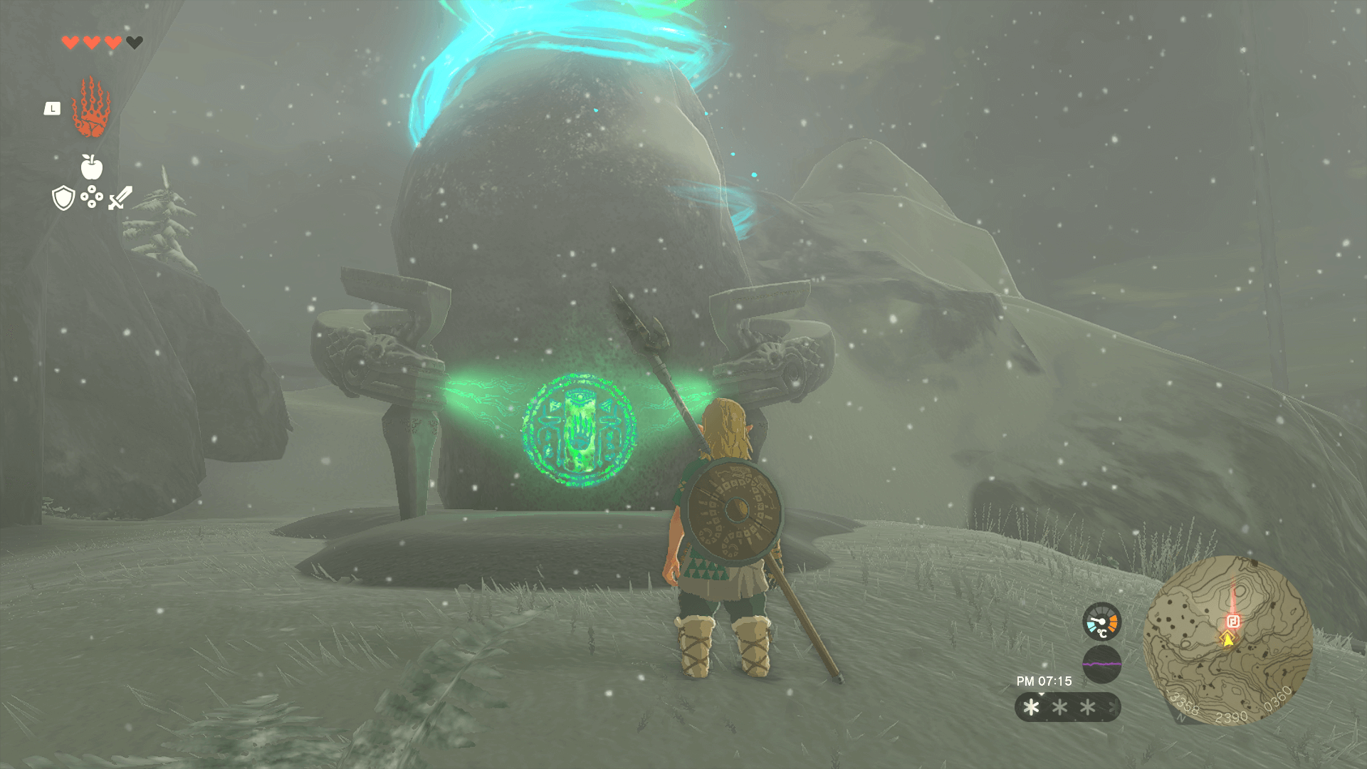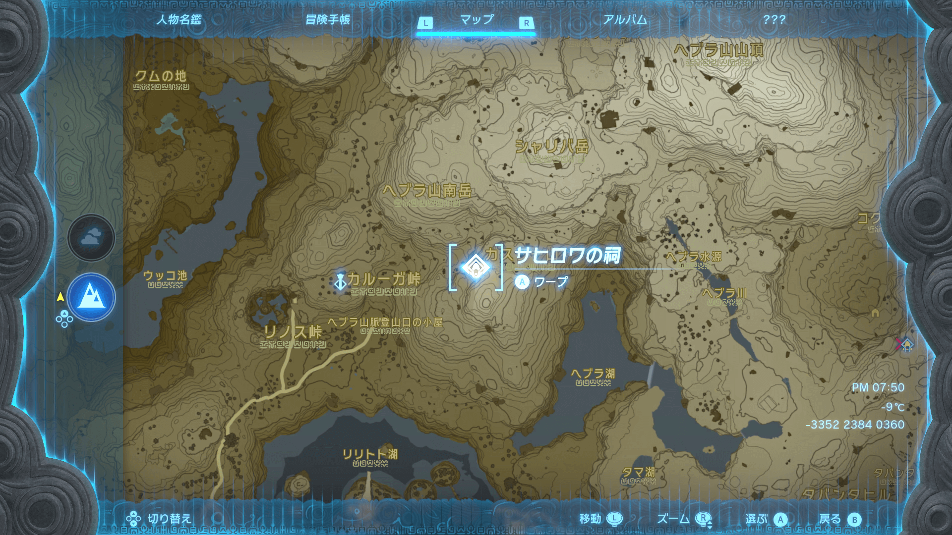 「サヒロワの祠」へは、近くの「カルーガ峠鳥望台」から大ジャンプすると簡単に行ける。また、ジャンプする前にマップ上に祠の大まかな位置にピンを刺しておくと、迷わずにたどり着ける。