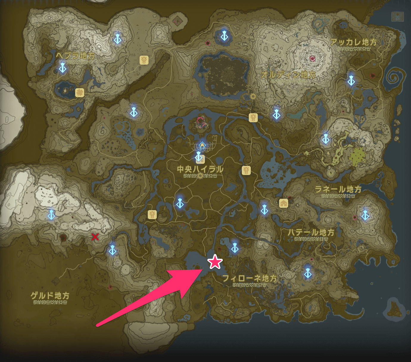 ポプラー高地鳥望台を解放したら、ハイリア湖の位置にピンを打とう。ハイリア湖は、ハイラル平原の南にある。大体の位置が分かれば良いので、細かい調整はしなくても問題ない。