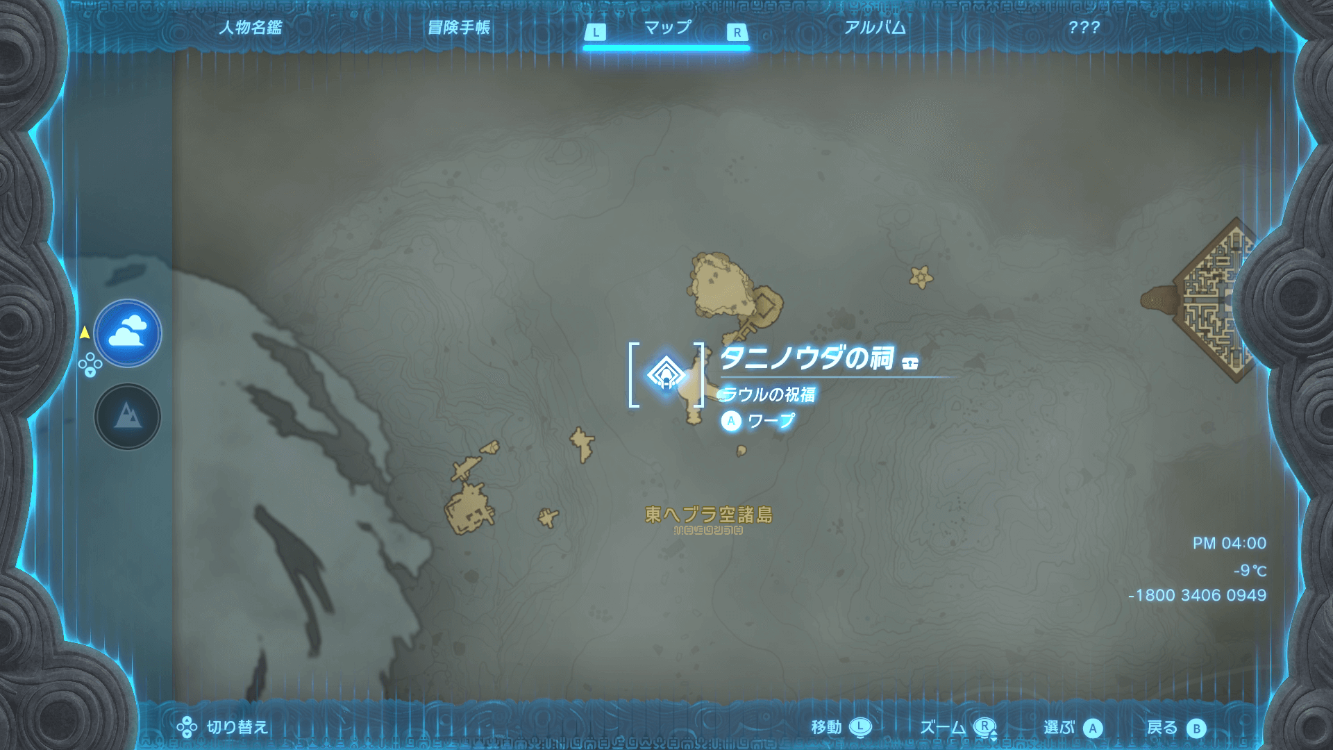 ツツキキ雪原鳥望台を解放したら、東ヘブラ空諸島の位置にピンを打とう。東ヘブラ空諸島は、ツツキキ雪原鳥望台の北東にある。大体の位置が分かれば良いので、細かい調整はしなくても問題ない。