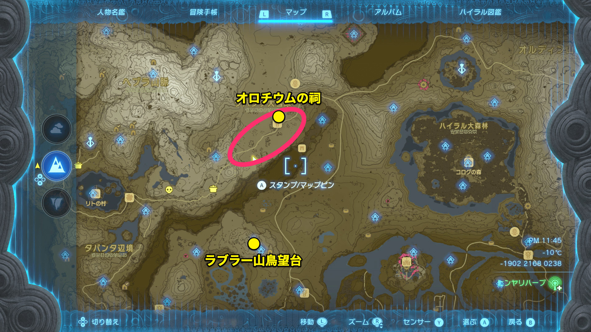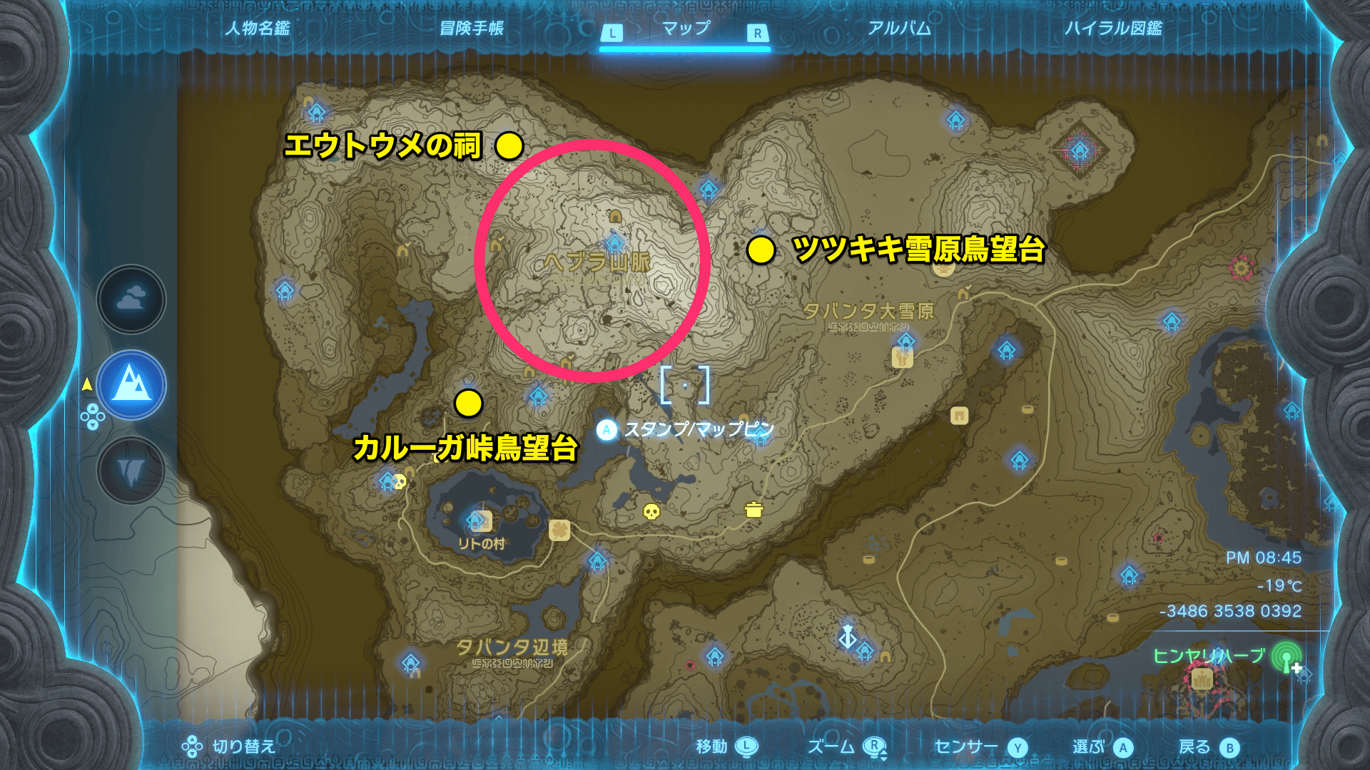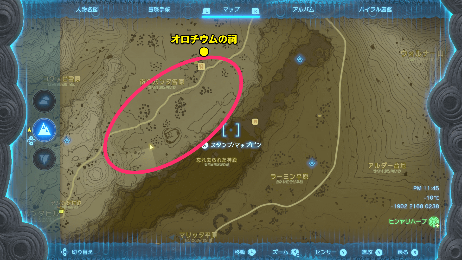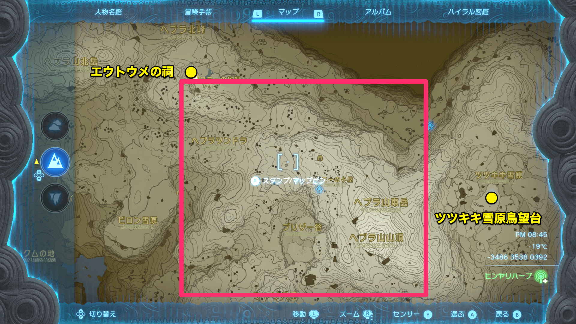 ヒンヤリハーブは、ヘブラ山脈で入手できる。ヘブラ山脈は高低差がありヒンヤリハーブを探すのが大変なので、図鑑センサーを使って探索するのがおすすめだ。
