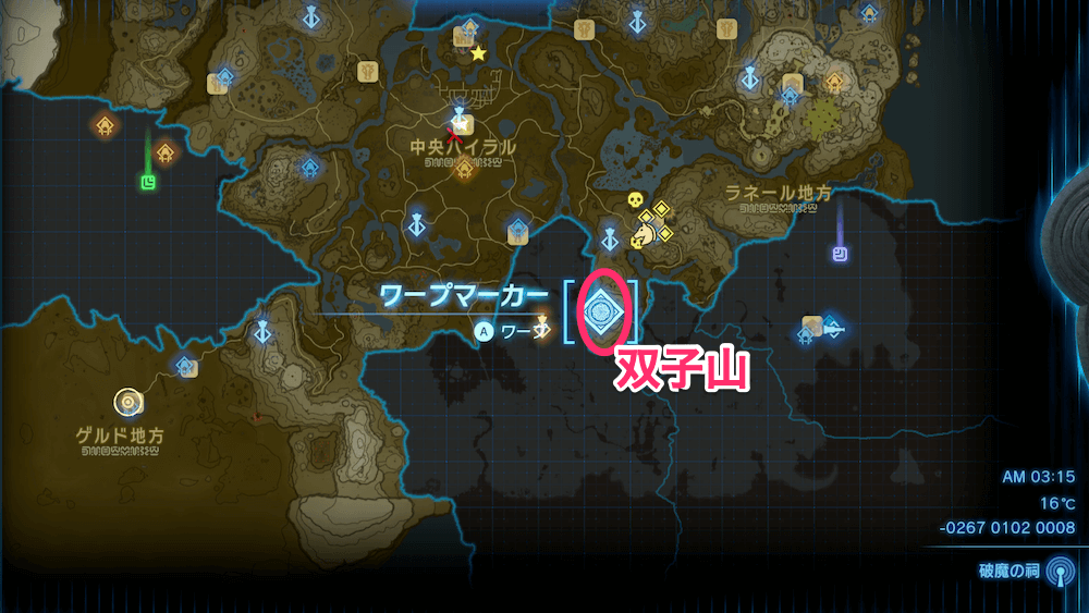 | 1 | ハイラルを見渡せる高所へ移動する └双子山山頂がおすすめ |