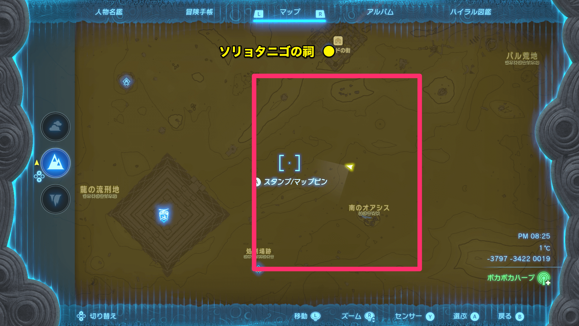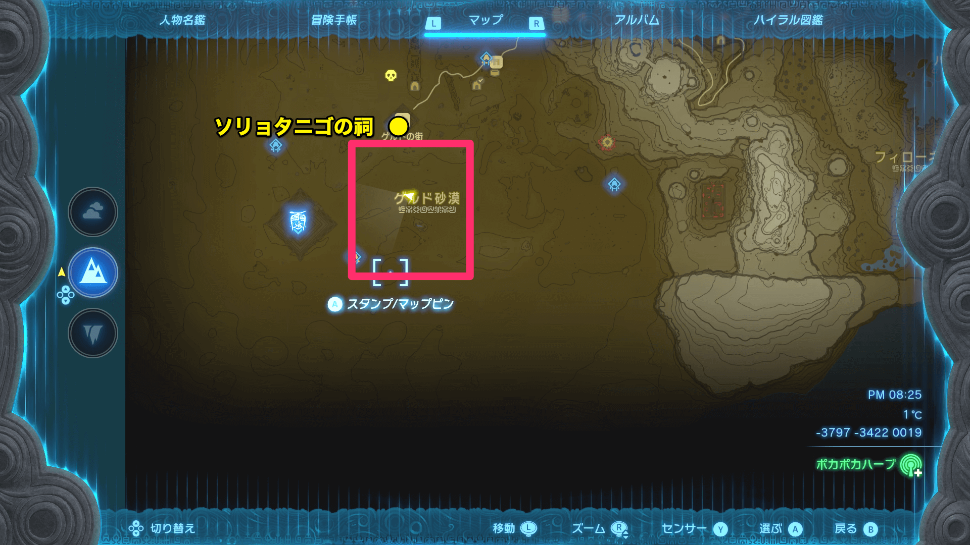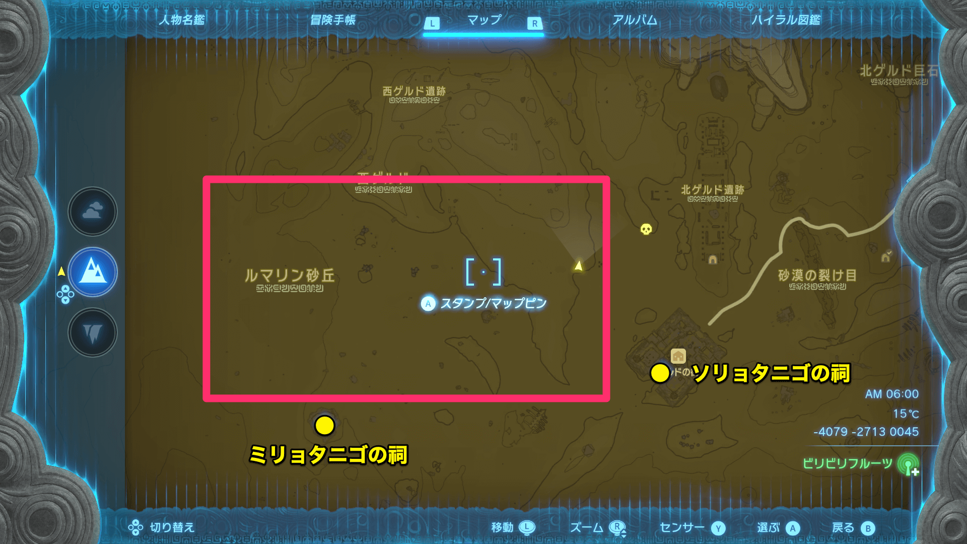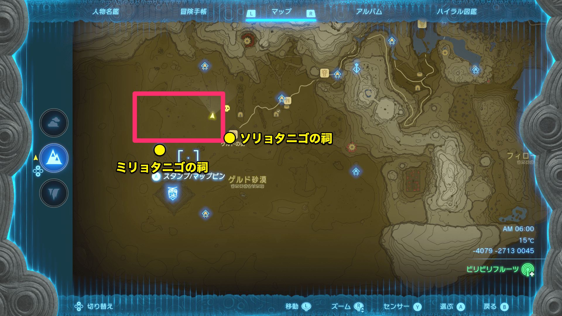 ビリビリフルーツは、ゲルドの街の西でも入手できる。集める際は、ゲルドの街にあるソリョタニゴの祠にワープして向かおう。